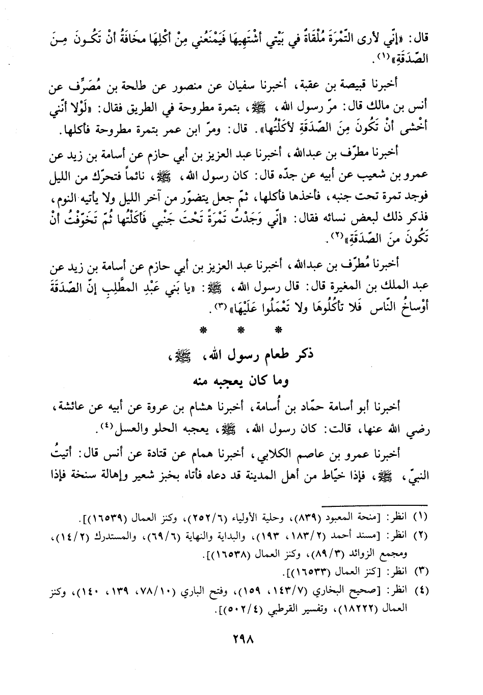 [أَخْبَرَنَا قَبِيصَةُ بْنُ عُقْبَةَ. أَخْبَرَنَا سُفْيَانُ عَنْ مَنْصُورٍ عَنْ طَلْحَةَ بْنِ مُصَرِّفٍ عَنْ أَنَسِ بْنِ مَالِكٍ قَالَ: مَرَّ رَسُولُ اللَّهِ - صَلَّى اللَّهُ عَلَيْهِ وَسَلَّمَ - بِتَمْرَةٍ مَطْرُوحَةٍ في الطريق فقال: لولا أنني أَخْشَى أَنْ تَكُونَ مِنَ الصَّدَقَةِ لأَكَلْتُهَا. قَالَ: وَمَرَّ ابْنُ عُمَرَ بِتَمْرَةٍ مَطْرُوحَةٍ فَأَكَلَهَا] .