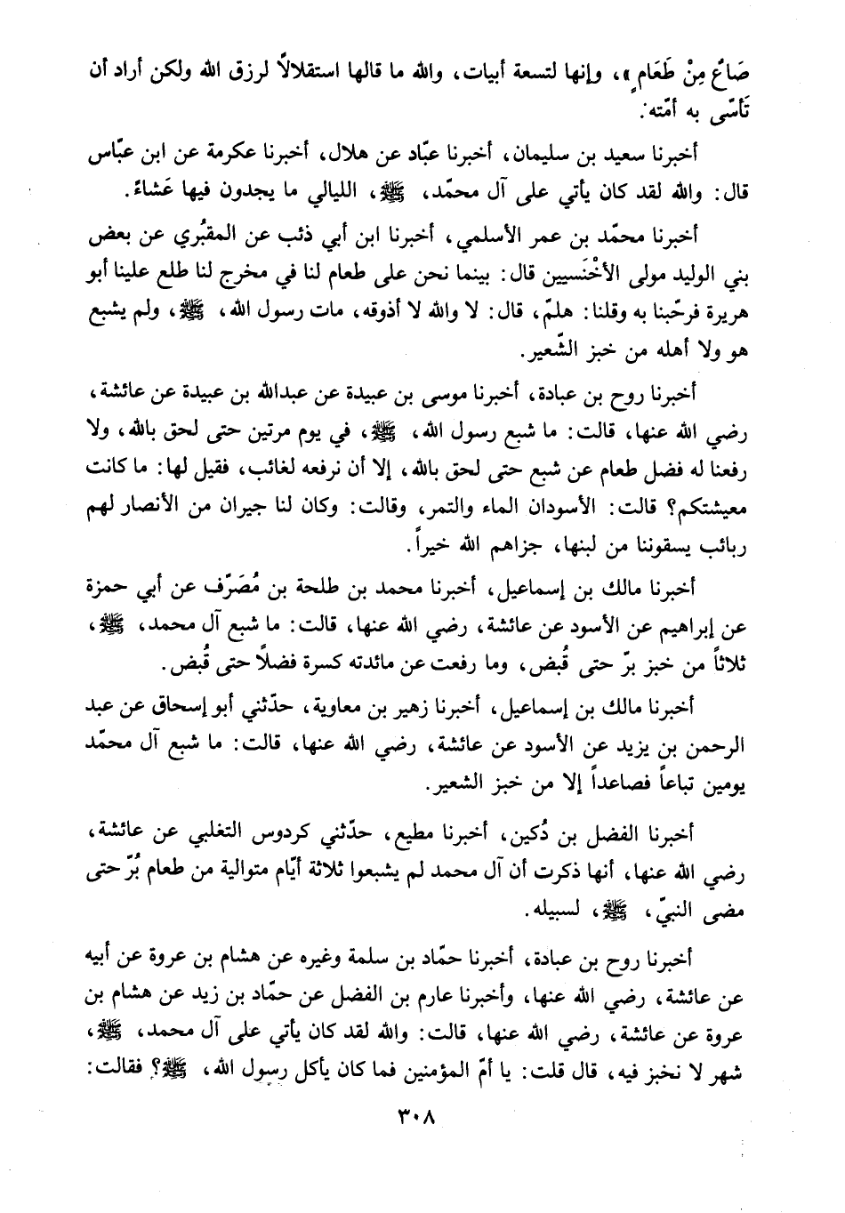 رَضِيَ اللَّهُ عَنْهَا. أَنَّهَا ذَكَرَتْ أَنَّ آلَ مُحَمَّدٍ لَمْ يَشْبَعُوا ثَلاثَةَ أَيَّامٍ مُتَوَالِيَةَ مِنْ طَعَامِ بُرٍّ حَتَّى مَضَى النَّبِيُّ - صَلَّى اللَّهُ عَلَيْهِ وَسَلَّمَ - لِسَبِيلِهِ.