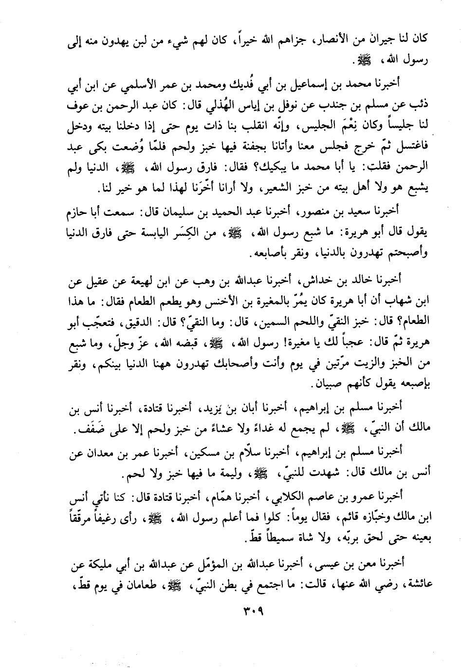 أَخْبَرَنَا عَمْرُو بْنُ عَاصِمٍ الْكِلابِيُّ. أَخْبَرَنَا هَمَّامٌ. أَخْبَرَنَا قَتَادَةُ قَالَ: كنا نأتي أنس ابن مَالِكٍ وَخَبَّازُهُ قَائِمٌ. فَقَالَ يَوْمًا: كُلُوا فَمَا أَعْلَمُ رَسُولَ اللَّهِ - صَلَّى اللَّهُ عَلَيْهِ وَسَلَّمَ - رَأَى رَغِيفًا مُرَقَّقًا بِعَيْنِهِ حَتَّى لَحِقَ بِرَبِّهِ. وَلا شَاةً سَمِيطًا قَطُّ.