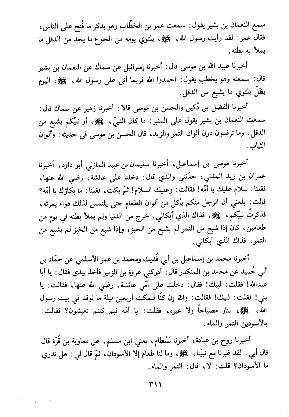 أَخْبَرَنَا مُحَمَّدُ بْنُ إِسْمَاعِيلَ بْنِ أَبِي فُدَيْكٍ وَمُحَمَّدُ بْنُ عُمَرَ الأَسْلَمِيُّ عَنْ حَمَّادِ بْنِ أَبِي حُمَيْدٍ عَنْ مُحَمَّدِ بْنِ الْمُنْكَدِرِ قَالَ: أَدْرَكَنِي عُرْوَةُ بْنُ الزُّبَيْرِ فَأَخَذَ بِيَدِي فَقَالَ: يَا أَبَا عَبْدِ اللَّهِ! فَقُلْتُ: لَبَّيْكَ! فَقَالَ: دَخَلْتُ عَلَى أُمِّي عَائِشَةَ. رَضِيَ اللَّهُ عَنْهَا. فَقَالَتْ: يَا بُنَيَّ! فَقُلْتُ: لَبَّيْكِ! فَقَالَتْ: وَاللَّهِ إِنْ كُنَّا لَنَمْكُثُ أَرْبَعِينَ لَيْلَةً مَا نُوقِدُ فِي بَيْتِ رَسُولِ اللَّهِ - صَلَّى اللَّهُ عَلَيْهِ وَسَلَّمَ - بِنَارٍ مِصْبَاحًا وَلا غَيْرَهُ. فَقُلْتُ: يَا أُمَّهْ فَبِمَ كُنْتُمْ تَعِيشُونَ؟ فَقَالَتْ: