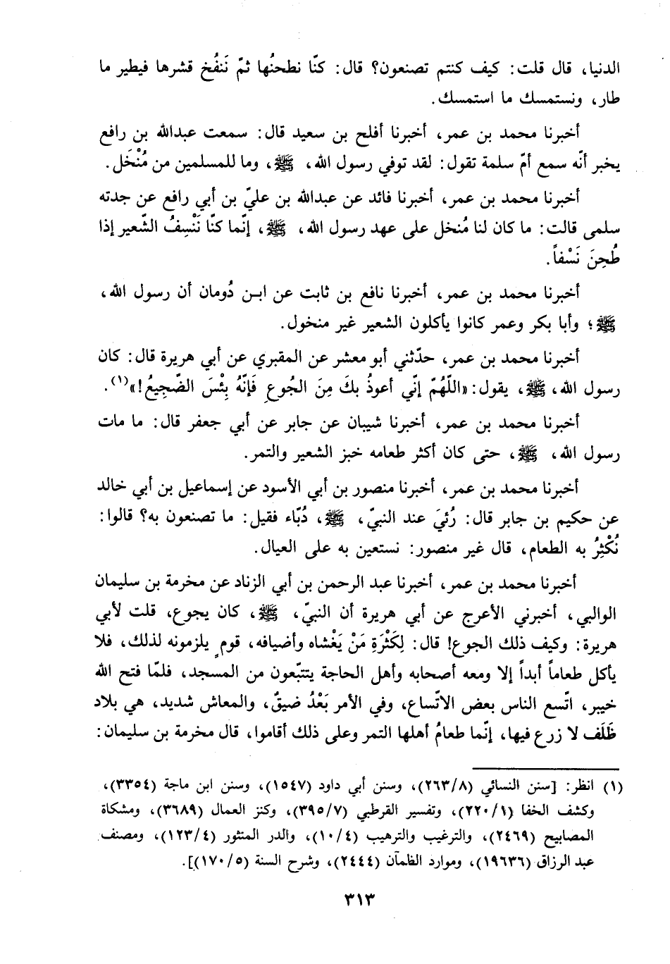 [أَخْبَرَنَا مُحَمَّدُ بْنُ عُمَرَ. حَدَّثَنِي أَبُو مَعْشَرٍ عَنِ الْمَقْبُرِيِّ عَنْ أَبِي هُرَيْرَةَ قَالَ: كَانَ رَسُولُ اللَّهِ - صَلَّى اللَّهُ عَلَيْهِ وسلم - يَقُولُ: اللَّهُمَّ إِنِّي أَعُوذُ بِكَ مِنَ الْجُوعِ فَإِنَّهُ بِئْسَ الضَّجِيعُ] ! «1» .