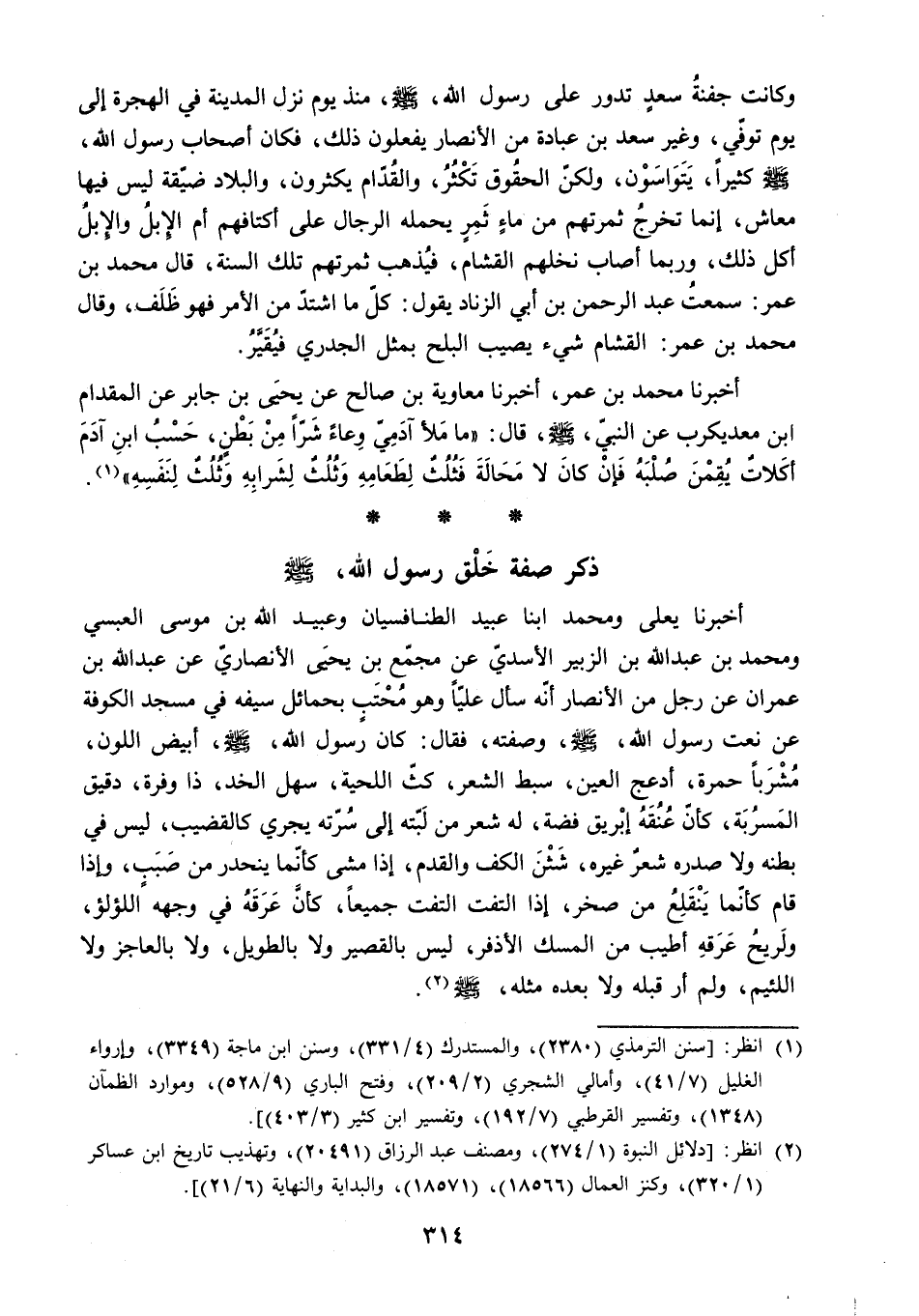 وَكَانَتْ جَفْنَةُ سَعْدٍ تَدُورُ عَلَى رَسُولِ اللَّهِ - صَلَّى اللَّهُ عَلَيْهِ وَسَلَّمَ - مُنْذُ يَوْمَ نَزَلَ الْمَدِينَةَ فِي الْهِجْرَةِ إِلَى يَوْمِ تُوُفِّيَ. وَغَيْرُ سَعْدِ بْنِ عُبَادَةَ مِنَ الأَنْصَارِ يَفْعَلُونَ ذَلِكَ. فَكَانَ أَصْحَابُ رَسُولِ اللَّهِ- صَلَّى اللَّهُ عَلَيْهِ وَسَلَّمَ - كَثِيرًا. يَتَوَاسُونَ. وَلَكِنَّ الْحُقُوقَ تَكْثُرُ. وَالْقُدَّامُ يَكْثُرُونَ. وَالْبِلادُ ضَيِّقَةٌ لَيْسَ فِيهَا مَعَاشٌ. إِنَّمَا تَخْرُجُ ثَمَرَتُهُمْ مِنْ مَاءٍ ثَمِرٍ يَحْمِلُهُ الرِّجَالُ عَلَى أَكْتَافِهِمْ أَمِ الإِبِلُ وَالإِبِلُ أَكَلَ ذَلِكَ. وَرُبَّمَا أَصَابَ نَخْلَهُمُ الْقُشَامُ. فَيُذْهِبُ ثَمَرَتَهُمْ تِلْكَ السَّنَةِ. قَالَ مُحَمَّدُ بْنُ عُمَرَ: سَمِعْتُ عَبْدَ الرَّحْمَنِ بْنَ أَبِي الزِّنَادِ يَقُولُ: كُلُّ مَا اشْتَدَّ مِنَ الأَمْرِ فَهُوَ ظَلَفٌ. وَقَالَ مُحَمَّدُ بْنُ عُمَرَ: الْقُشَامُ شَيْءٌ يُصِيبُ الْبَلَحَ بِمِثْلِ الْجُدَرِيِّ فَيُقَيَّرُ.
