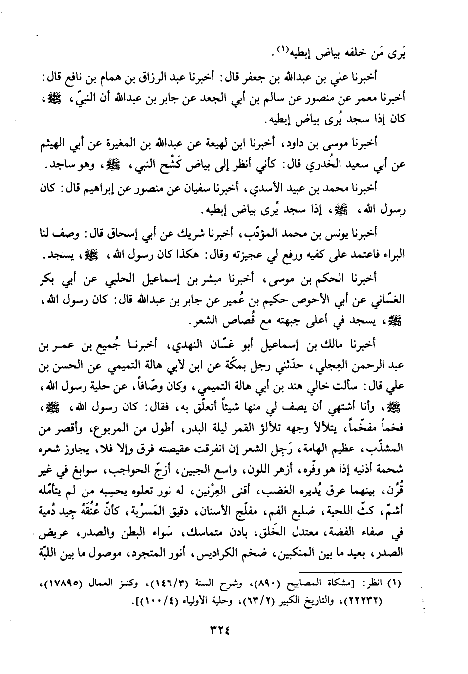 [أَخْبَرَنَا مَالِكُ بْنُ إِسْمَاعِيلَ أَبُو غَسَّانَ النَّهْدِيُّ. أَخْبَرَنَا جَمِيعُ بْنُ عُمَرَ بْنِ عَبْدِ الرَّحْمَنِ الْعِجْلِيُّ. حَدَّثَنِي رَجُلٌ بِمَكَّةَ عَنِ ابْنٍ لأَبِي هَالَةَ التَّمِيمِيِّ عَنِ الْحَسَنِ بْنِ عَلِيٍّ قَالَ: سَأَلْتُ خَالِي هِنْدَ بْنَ أَبِي هَالَةَ التَّمِيمِيَّ. وكان وصافا. عن حلية رسول الله.