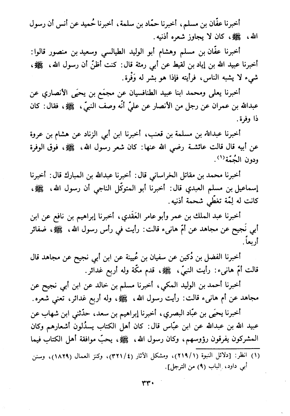 (1) انظر: [دلائل النبوة (1/ 219) ، ومشكل الآثار (4/ 321) ، وكنز العمال (1829) ، وسنن أبي داود، الباب (9) من الترجل) ] .