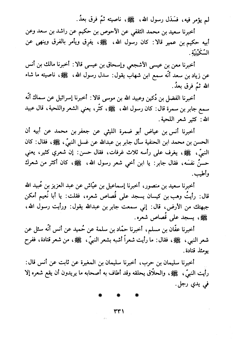 أَخْبَرَنَا عَفَّانُ بْنُ مُسْلِمٍ. أَخْبَرَنَا حَمَّادُ بْنُ سَلَمَةَ عَنْ حُمَيْدٍ عَنْ أَنَسٍ أَنَّهُ سُئِلَ عَنْ شَعْرِ النَّبِيِّ - صَلَّى اللَّهُ عَلَيْهِ وَسَلَّمَ - فَقَالَ: مَا رَأَيْتُ شَعْرًا أَشْبَهَ بِشَعْرِ النَّبِيِّ - صَلَّى اللَّهُ عَلَيْهِ وَسَلَّمَ - مِنْ شَعْرِ قَتَادَةَ. فَفَرِحَ يَوْمَئِذٍ قَتَادَةُ.