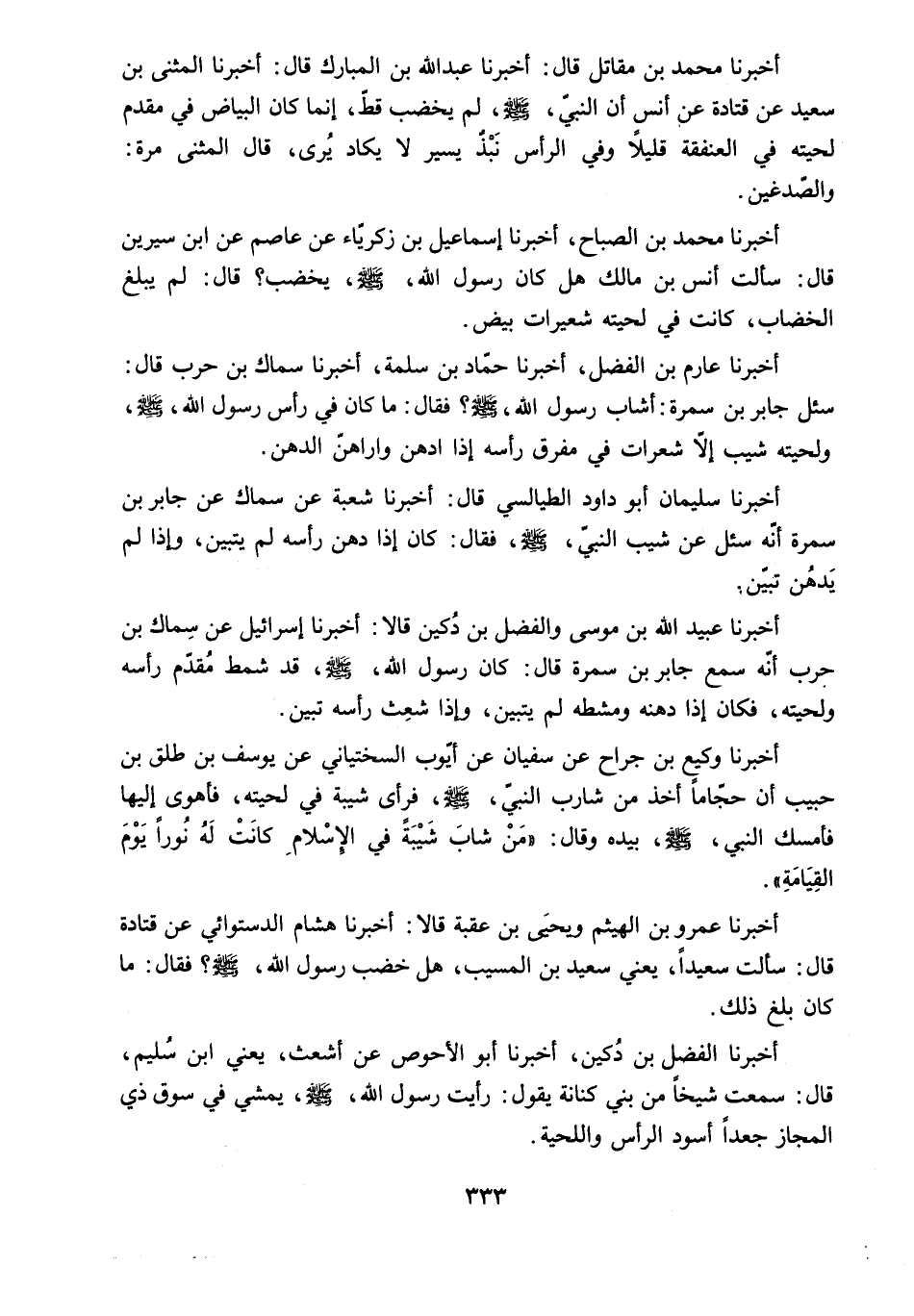 أَخْبَرَنَا سُلَيْمَانُ أَبُو دَاوُدَ الطَّيَالِسِيُّ قَالَ: أَخْبَرَنَا شُعْبَةُ عَنْ سِمَاكٍ عَنْ جَابِرِ بْنِ سَمُرَةَ أَنَّهُ سُئِلَ عَنْ شَيْبِ النَّبِيِّ - صَلَّى اللَّهُ عَلَيْهِ وَسَلَّمَ - فَقَالَ: كَانَ إِذَا دَهَنَ رَأْسَهُ لَمْ يَتَبَيَّنْ. وَإِذَا لَمْ يَدْهُنْ تَبَيَّنَ.