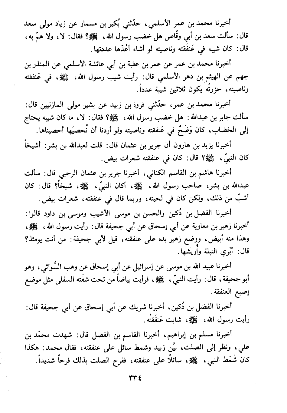 سَأَلْتُ جَابِرَ بْنَ عَبْدِ اللَّهِ: هَلْ خَضَبَ رسول الله. ص؟ فَقَالَ: لا. مَا كَانَ شَيْبُهُ يَحْتَاجُ إِلَى الْخِضَابِ. كَانَ وَضَحَ فِي عَنْفَقَتِهِ وَنَاصِيَتِهِ وَلَوْ أَرَدْنَا أَنْ نُحْصِيَهَا أَحْصَيْنَاهَا.