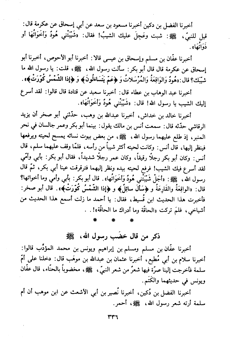 [أَخْبَرَنَا عَفَّانُ بْنُ مُسْلِمٍ وَإِسْحَاقُ بْنُ عِيسَى قَالا: أَخْبَرَنَا أَبُو الأَحْوَصِ. أَخْبَرَنَا أَبُو إِسْحَاقَ عَنْ عِكْرِمَةَ قَالَ قَالَ أَبُو بَكْرٍ: سَأَلْتُ رَسُولَ اللَّهِ - صَلَّى اللَّهُ عَلَيْهِ وَسَلَّمَ - قُلْتُ: يَا رَسُولَ اللَّهِ مَا شيبك؟ قال: هود والواقعة والْمُرْسَلاتِ و «عَمَّ يَتَساءَلُونَ» و «إِذَا الشَّمْسُ كُوِّرَتْ] » .