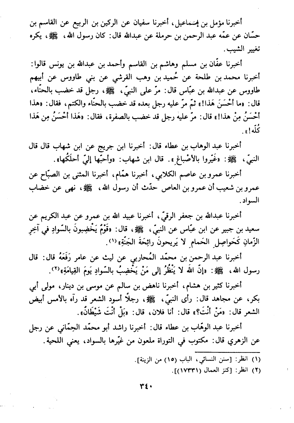[أَخْبَرَنَا عَمْرُو بْنُ عَاصِمٍ الْكِلابِيُّ. أَخْبَرَنَا هَمَّامٌ. أَخْبَرَنَا الْمُثَنَّى بْنُ الصَّبَّاحِ عَنْ عَمْرِو بْنِ شُعَيْبٍ أَنَّ عَمْرَو بْنَ الْعَاصِ حَدَّثَ أن رسول الله - صلى الله عليه وسلم - نَهَى عَنْ خِضَابِ السَّوَادِ] .