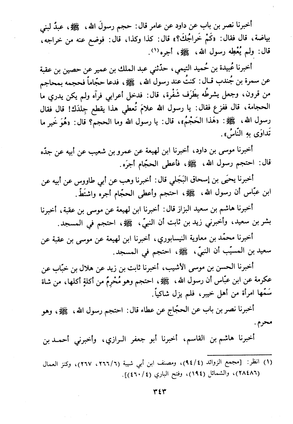 أَخْبَرَنَا مُوسَى بْنُ دَاوُدَ. أَخْبَرَنَا ابْنُ لَهِيعَةَ عَنْ عَمْرِو بْنِ شُعَيْبٍ عَنْ أَبِيهِ عَنْ جَدِّهِ قَالَ: احْتَجَمَ رَسُولُ اللَّهِ - صَلَّى اللَّهُ عَلَيْهِ وَسَلَّمَ - فَأَعْطَى الْحَجَّامَ أَجْرَهُ.