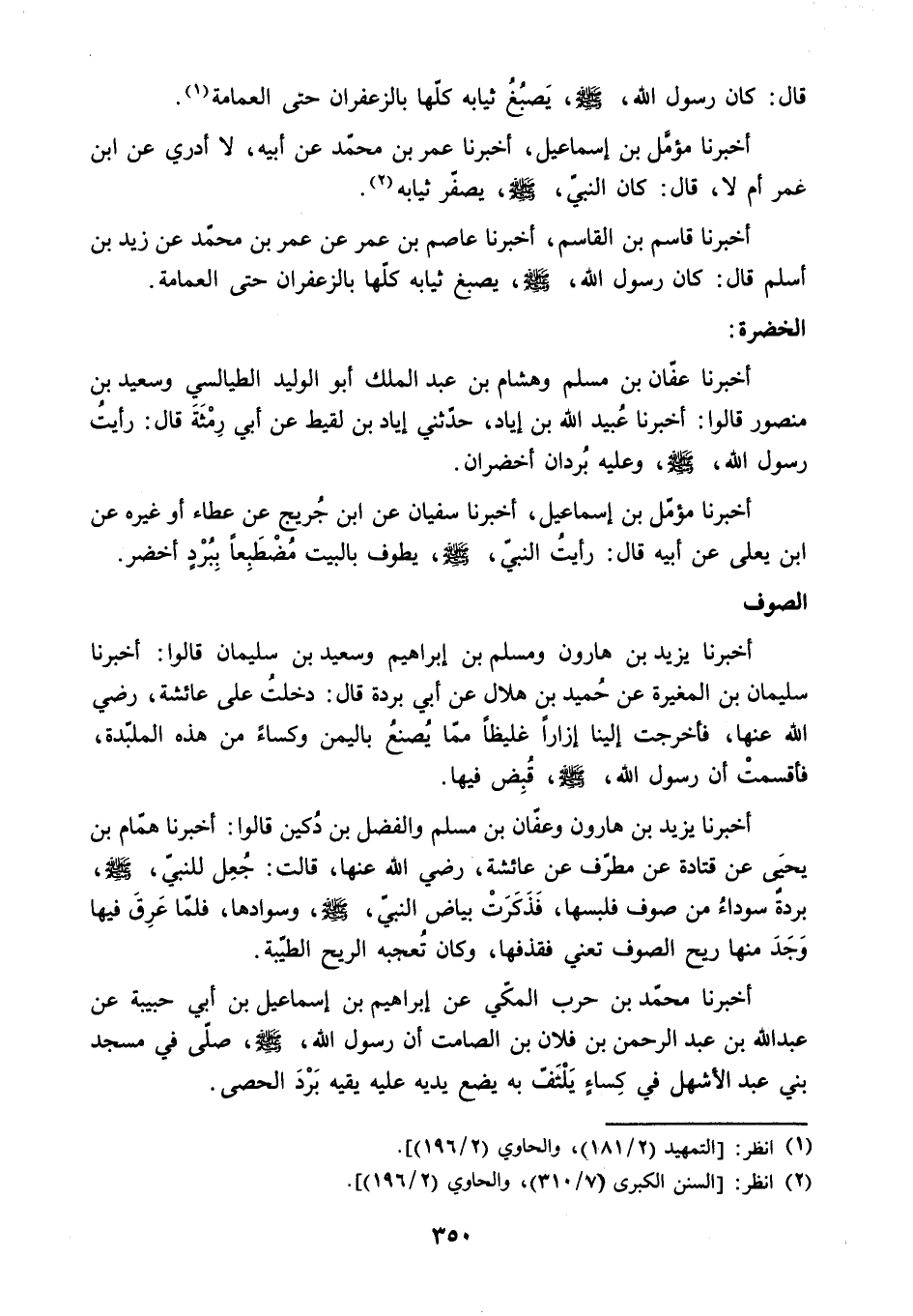 أَخْبَرَنَا مُؤَمَّلُ بْنُ إِسْمَاعِيلَ. أَخْبَرَنَا عُمَرُ بْنُ مُحَمَّدٍ عَنْ أَبِيهِ. لا أَدْرِي عَنِ ابْنِ عُمَرَ أَمْ لا. قَالَ: كَانَ النَّبِيُّ - صَلَّى اللَّهُ عَلَيْهِ وَسَلَّمَ - يُصَفِّرُ ثِيَابَهُ «2» .