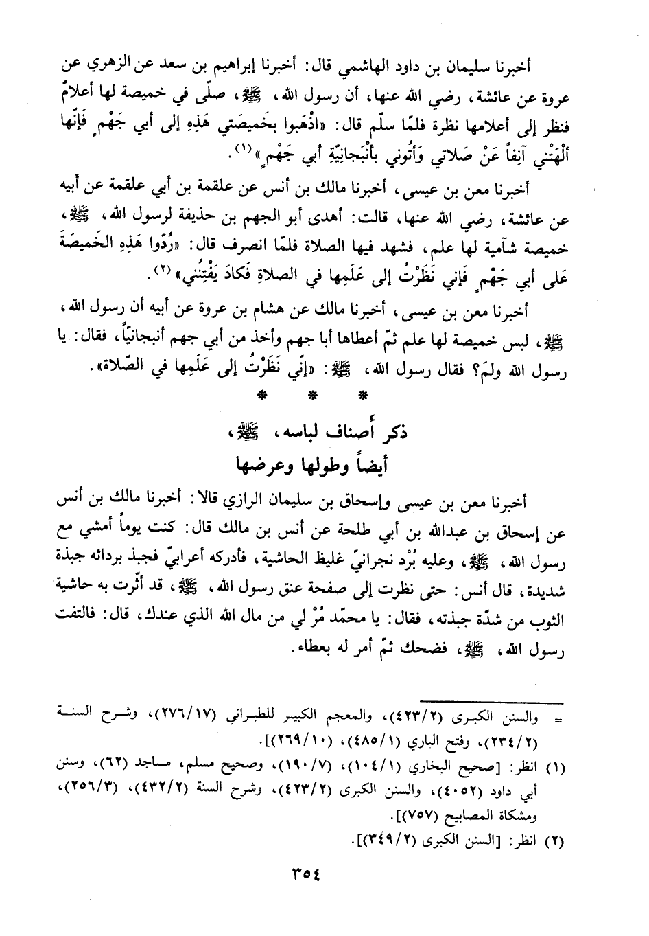 [أَخْبَرَنَا سُلَيْمَانُ بْنُ دَاوُدَ الْهَاشِمِيُّ قَالَ: أَخْبَرَنَا إِبْرَاهِيمُ بْنُ سَعْدٍ عَنِ الزُّهْرِيِّ عَنْ عُرْوَةَ عَنْ عَائِشَةَ. رَضِيَ اللَّهُ عَنْهَا. أَنَّ رَسُولَ اللَّهِ - صَلَّى اللَّهُ عَلَيْهِ وَسَلَّمَ - صَلَّى فِي خَمِيصَةٍ لَهَا أَعْلامٌ فَنَظَرَ إِلَى أَعْلامِهَا نَظْرَةً فَلَمَّا سَلَّمَ قَالَ: اذْهَبُوا بِخَمِيصَتِي هَذِهِ إِلَى أَبِي جَهْمٍ فَإِنَّهَا أَلْهَتْنِي آنِفًا عَنْ صَلاتِي وَأْتُونِي بِأَنْبَجَانِيَّةِ أَبِي جَهْمٍ] » .