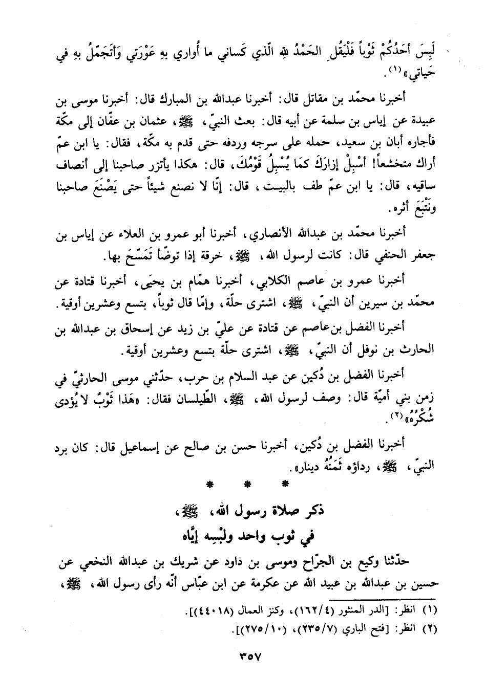 [أَخْبَرَنَا الْفَضْلُ بْنُ دُكَيْنٍ عَنْ عَبْدِ السَّلامِ بْنِ حَرْبٍ. حَدَّثَنِي مُوسَى الْحَارِثِيُّ فِي زَمَنِ بَنِي أُمَيَّةَ قَالَ: وُصِفَ لِرَسُولِ اللَّهِ - صَلَّى اللَّهُ عَلَيْهِ وَسَلَّمَ - الطَّيْلَسَانُ فَقَالَ: هَذَا ثَوْبٌ لا يُؤَدَّى شُكْرُهُ] «2» .