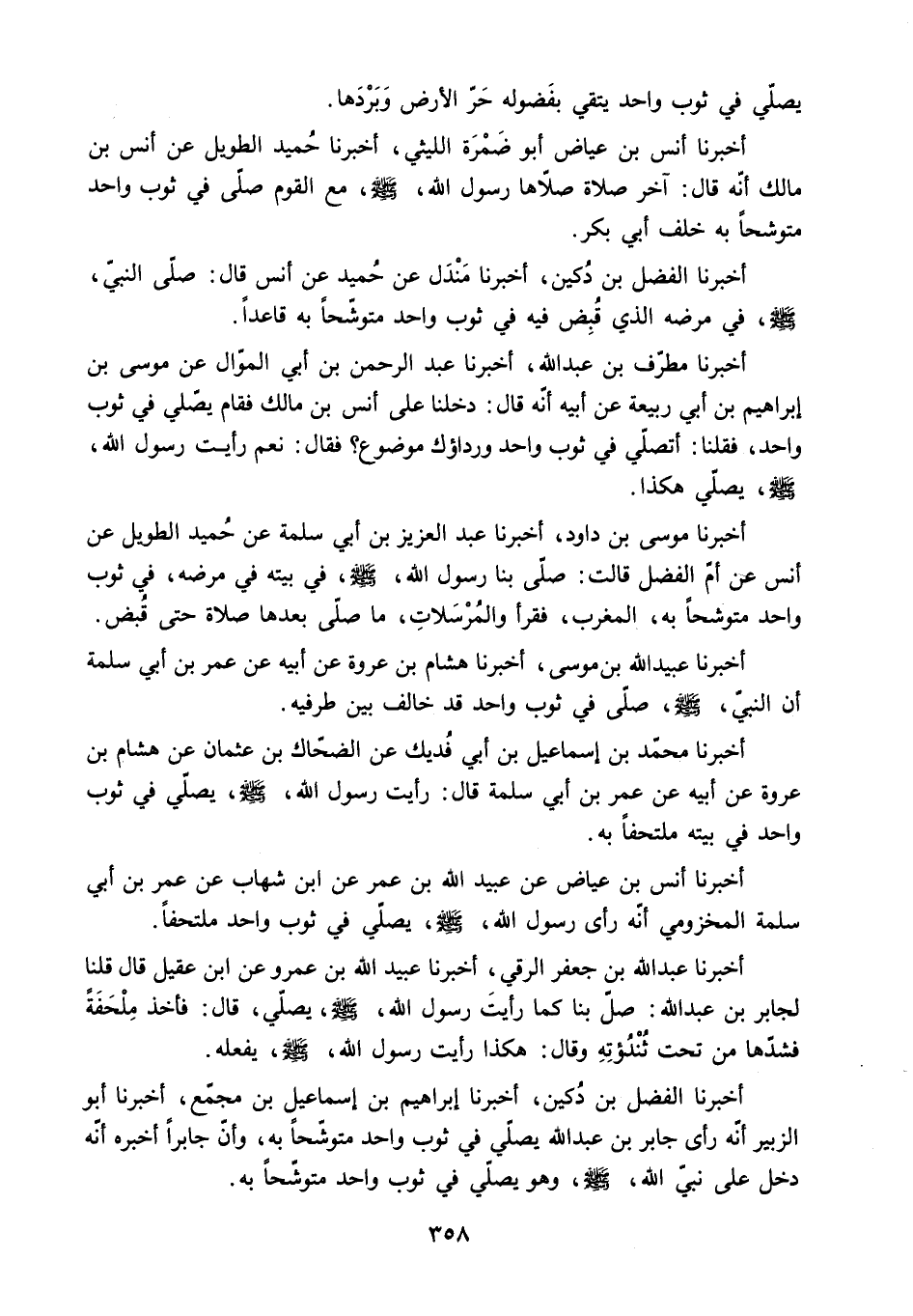 أَخْبَرَنَا الْفَضْلُ بْنُ دُكَيْنٍ. أَخْبَرَنَا إِبْرَاهِيمُ بْنُ إِسْمَاعِيلَ بْنِ مُجَمِّعٍ. أَخْبَرَنَا أَبُو الزُّبَيْرِ أَنَّهُ رَأَى جَابِرَ بْنَ عَبْدِ اللَّهِ يُصَلِّي فِي ثَوْبٍ وَاحِدٍ مُتَوَشِّحًا بِهِ. وَأَنَّ جَابِرًا أَخْبَرَهُ أَنَّهُ دَخَلَ عَلَى نَبِيِّ اللَّهِ - صَلَّى اللَّهُ عَلَيْهِ وَسَلَّمَ - وَهُوَ يُصَلِّي فِي ثَوْبٍ وَاحِدٍ مُتَوَشِّحًا بِهِ.