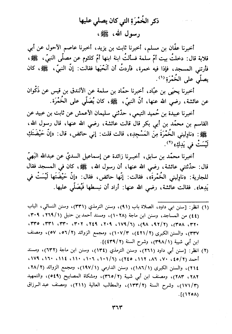 [أَخْبَرَنَا مُحَمَّدُ بْنُ سَابِقٍ. أَخْبَرَنَا زَائِدَةُ عَنْ إِسْمَاعِيلَ السُّدِّيِّ عَنْ عَبْدِ اللَّهِ الْبَهِيِّ قَالَ: حَدَّثَتْنِي عَائِشَةُ. رَضِيَ اللَّهُ عَنْهَا. أَنَّ رَسُولَ اللَّهِ - صَلَّى اللَّهُ عَلَيْهِ وَسَلَّمَ - كَانَ فِي الْمَسْجِدِ فَقَالَ لِلْجَارِيَةِ: نَاوِلِينِي الْخُمْرَةَ. فَقَالَتْ: إِنَّهَا حَائِضٌ. فَقَالَ: إِنَّ حَيْضَتَهَا لَيْسَتْ فِي يَدِهَا. فَقَالَتْ عَائِشَةُ. رَضِيَ اللَّهُ عَنْهَا: أَرَادَ أَنْ نَبْسُطَهَا فَيُصَلِّي عليها] .