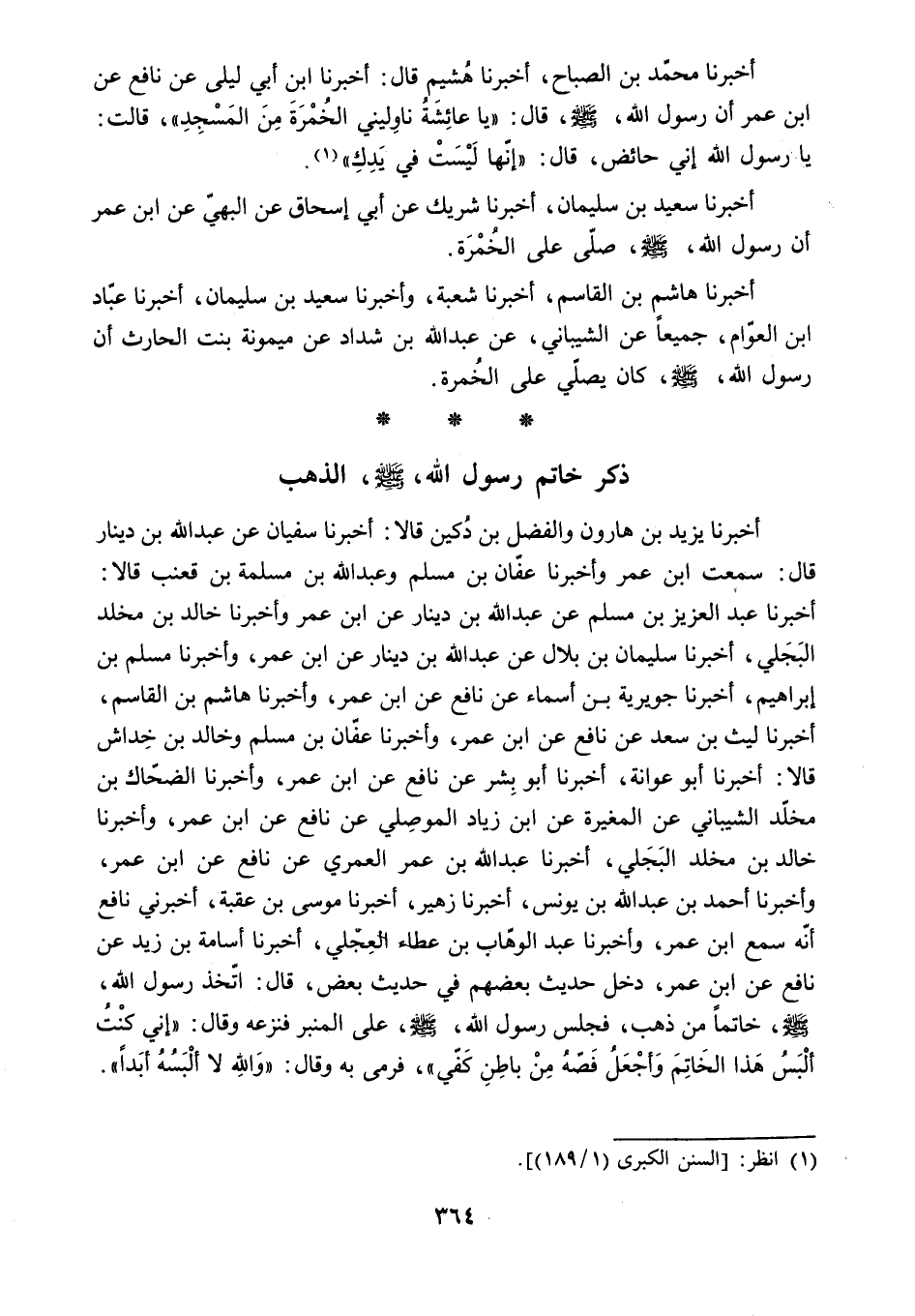 أَخْبَرَنَا لَيْثُ بْنُ سَعْدٍ عَنْ نَافِعٍ عَنِ ابْنِ عُمَرَ. وَأَخْبَرَنَا عَفَّانُ بْنُ مُسْلِمٍ وَخَالِدُ بْنُ خِدَاشٍ قَالا: أَخْبَرَنَا أَبُو عَوَانَةَ. أَخْبَرَنَا أَبُو بِشْرٍ عَنْ نَافِعٍ عَنِ ابْنِ عُمَرَ. وَأَخْبَرَنَا الضَّحَّاكُ بن مخلد الشيباني عن المغيرة عن ابن زِيَادٍ الْمَوْصِلِيِّ عَنْ نَافِعٍ عَنِ ابْنِ عُمَرَ. وَأَخْبَرَنَا خَالِدُ بْنُ مَخْلَدٍ الْبَجَلِيُّ. أَخْبَرَنَا عَبْدُ اللَّهِ بْنُ عُمَرَ الْعُمَرِيُّ عَنْ نَافِعٍ عَنِ ابْنِ عُمَرَ.