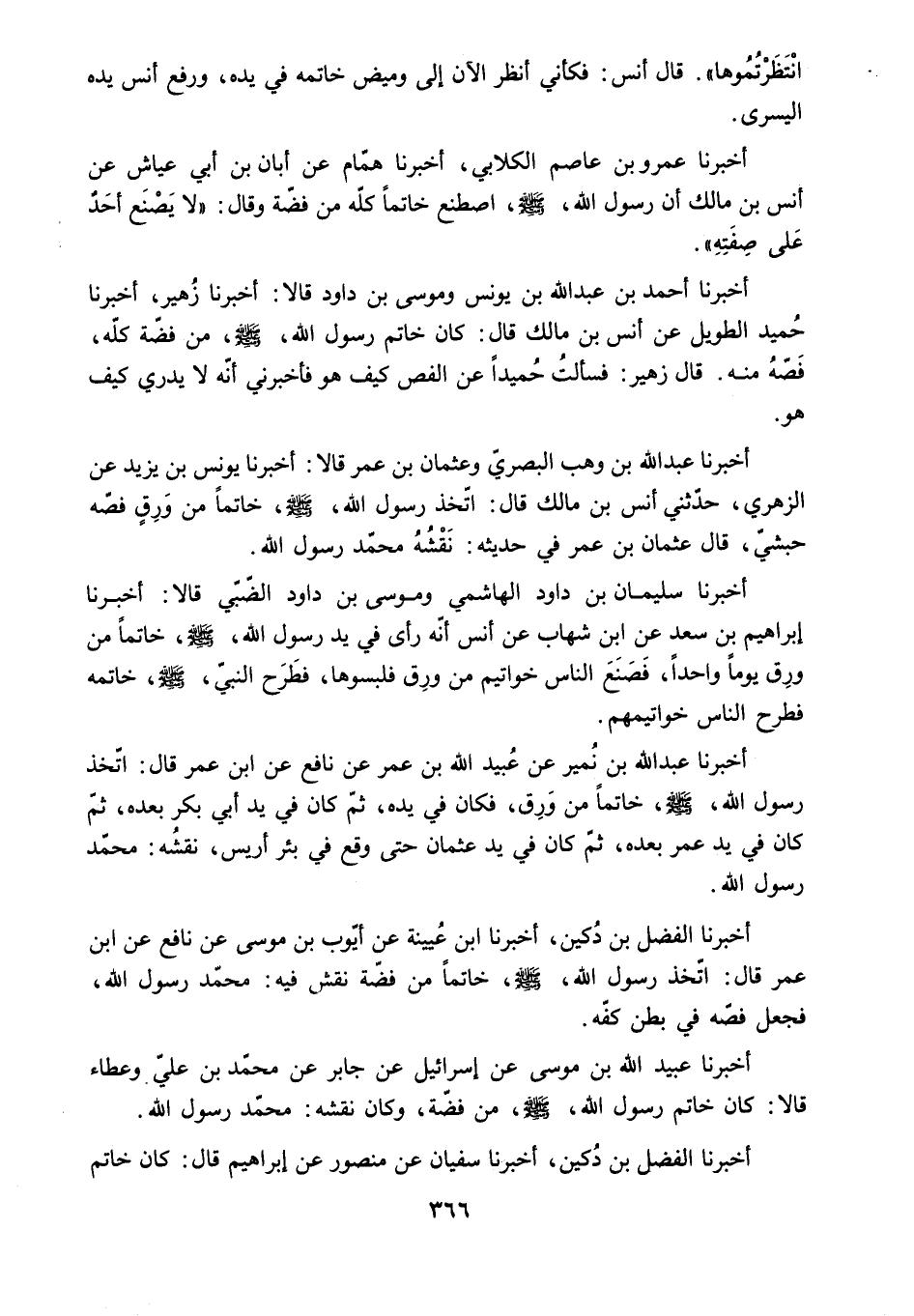 [أَخْبَرَنَا عَمْرُو بْنُ عَاصِمٍ الْكِلابِيُّ. أَخْبَرَنَا هَمَّامٌ عَنْ أَبَانَ بْنِ أَبِي عَيَّاشٍ عَنْ أَنَسِ بْنِ مَالِكٍ أَنَّ رَسُولَ اللَّهِ - صلى اللَّهُ عَلَيْهِ وَسَلَّمَ - اصْطَنَعَ خَاتَمًا كُلَّهُ مِنْ فِضَّةٍ وَقَالَ: لا يَصْنَعُ أَحَدٌ عَلَى صِفَتِهِ] .
