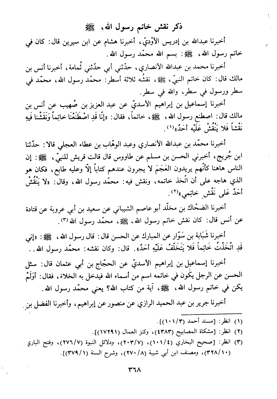 [أَخْبَرَنَا إِسْمَاعِيلُ بْنُ إِبْرَاهِيمَ الأَسَدِيُّ عَنْ عَبْدِ الْعَزِيزِ بْنِ صُهَيْبٍ عَنْ أَنَسِ بن مالك قَالَ: اصْطَنَعَ رَسُولُ اللَّهِ - صَلَّى اللَّهُ عَلَيْهِ وَسَلَّمَ - خَاتَمًا. فَقَالَ: إِنَّا قَدِ اصْطَنَعْنَا خَاتَمًا وَنَقَشْنَا فِيهِ نَقْشًا فَلا يَنْقُشْ عَلَيْهِ أَحَدٌ] «1» .