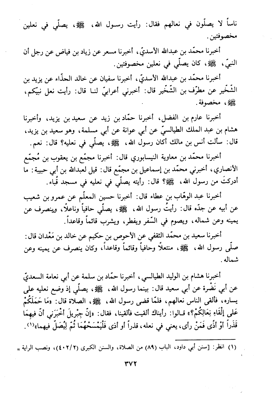 نَاسًا لا يُصَلُّونَ فِي نِعَالِهِمْ فَقَالَ: رَأَيْتُ رَسُولَ اللَّهِ - صَلَّى اللَّهُ عَلَيْهِ وَسَلَّمَ - يصلي فِي نَعْلَيْنِ مَخْصُوفَتَيْنِ.
