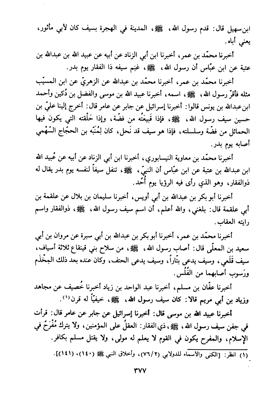 أَخْبَرَنَا مُحَمَّدُ بْنُ عُمَرَ. أَخْبَرَنَا مُحَمَّدُ بْنُ عَبْدِ اللَّهِ عَنِ الزُّهْرِيِّ عَنِ ابْنِ الْمُسَيَّبِ مِثْلَهُ فَأَقَرَّ رَسُولُ اللَّهِ - صَلَّى اللَّهُ عَلَيْهِ وَسَلَّمَ - اسْمَهُ. أَخْبَرَنَا عُبَيْدُ اللَّهِ بْنُ مُوسَى وَالْفَضْلُ بْنُ دُكَيْنٍ وَأَحْمَدُ ابن عَبْدِ اللَّهِ بْنِ يُونُسَ قَالُوا: أَخْبَرَنَا إِسْرَائِيلُ عَنْ جَابِرٍ عَنْ عَامِرٍ قَالَ: أَخْرَجَ إِلَيْنَا عَلِيُّ بْنُ حُسَيْنٍ سَيْفَ رَسُولِ اللَّهِ - صَلَّى اللَّهُ عَلَيْهِ وَسَلَّمَ - فَإِذَا قَبِيعَتُهُ مِنْ فِضَّةٍ. وَإِذَا حَلْقَتُهُ الَّتِي يَكُونُ فِيهَا الْحَمَائِلُ مِنْ فِضَّةٍ وَسِلْسِلَتُهُ. فَإِذَا هُوَ سَيْفٌ قَدْ نَحِلَ. كَانَ لِمُنَبِّهِ بْنِ الْحَجَّاجِ السَّهْمِيِّ أَصَابَهُ يَوْمَ بَدْرٍ.
