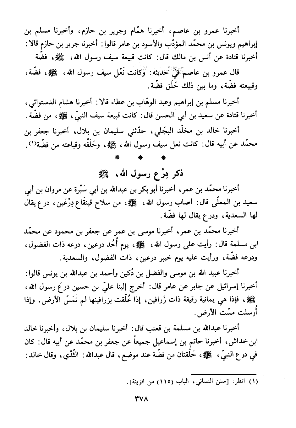 [أَخْبَرَنَا خَالِدُ بْنُ مَخْلَدٍ الْبَجَلِيُّ. حَدَّثَنِي سُلَيْمَانُ بْنُ بِلالٍ. أَخْبَرَنَا جَعْفَرُ بْنُ مُحَمَّدٍ عَنْ أَبِيهِ قَالَ: كَانَتْ نَعْلُ سَيْفِ رَسُولِ اللَّهِ - صَلَّى اللَّهُ عَلَيْهِ وَسَلَّمَ - وَحِلَقُهُ وَقِبَاعَتُهُ مِنْ فِضَّةٍ] «1» .