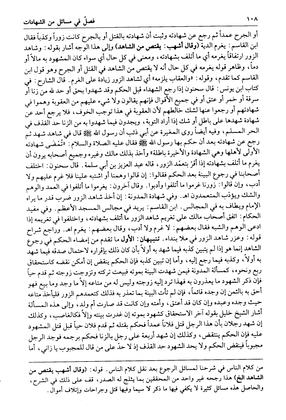وفي شهادة المدونة إن أخذ شاهد الزور ضرب قدر ما يراه الإمام ويطاف به في المجالس ابن القاسم يريد في مجالس المسجد الأعظم وفي مفيد الحكام اتفق أصحاب مالك على تغريم شاهد الزور ما أتلف بشهادته واختلفوا في تغريمه إذا ادعى الوهم والشبه فقال بعضهم لا غرم ولا أدب وقال بعضهم يغرم ا هـ وراجع شراح قوله وعزر شاهد الزور في ملأ بنداء تنبيهان الأول ما تقدم من إمضاء الحكم في رجوع الشاهد إنما هو إذا لم يتبين كذبه فيما شهد به أولا بأن كان ذلك بإقراره لاحتمال صدقه فيما شهد به أولا وكذبه فيما رجع إليه وأما إن تبين كذبه فإن الحكم ينقض إن أمكن نقضه كاستحقاق ربع ونحوه كمسألة المدونة فيمن شهدت البينة بموته فبيعت تركته وتزوجت زوجته ثم قدم حيا فإن ذكر الشهود ما يعذرون به فهذا ترد إليه زوجته وليس له من متاعه إلا ما وجد وما بيع فهو أحق به بالثمن إن وجده قائما فإن لم تأت البينة بما تعذر به فذلك كتعمدهم الزور فليأخذ متاعه حيث وجده وعبده وإن كان قد أعتق وأمته وإن كانت قد صارت أم ولد وإلى هذه المسألة أشار الشيخ خليل بقوله آخر الاستحقاق كشهود بموته إن غدرت بينته وإلا فكالغاصب وكذلك إن شهد رجلان بأن هذا الرجل قتل فلانا عمدا فحكم بقتله ثم قدم فلان حيا قبل قتل المشهود عليه فإن الحكم ينتقض وكذلك إن شهد أربعة على رجل بالزنا فحكم برجمه فوجد الرجل مجبوبا فينقض الحكم ولا يحد الشهود حد القذف إذ لا حد على من قال للمجبوب يا زاني أما