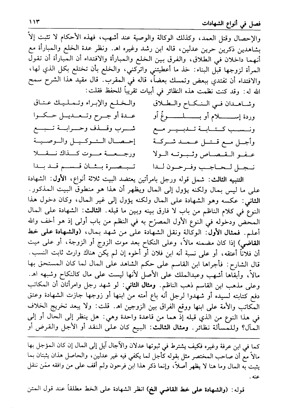 قال مقيد هذا الشرح سمح الله له وقد كنت نظمت هذه النظائر في أبيات تقريبا للحفظ فقلت وشاهدان في النكاح والطلاق والخلع والإبراء وتمليك عتاق وردة إسلام أو بلوغ أو عدة أو جرح وتعديل حكوا ونسب كتابة تدبير مع شرب وقذف وحرابة تبع وأجل مع قتل عمد شركة إحصال التوكيل والوصية عفو القصاص وثبوته الولا ورجعة موت كذاك نقلا نجل لحاجب وفرحون لدا تبصرة بثان قسم قد بدا التنبيه الثالث شمل قوله ورجل بامرأتين يعتضد البيت ثلاثة أنواع الأول الشهادة على ما ليس بمال ولكنه يؤول إلى المال ويظهر أن هذا هو منطوق البيت المذكور