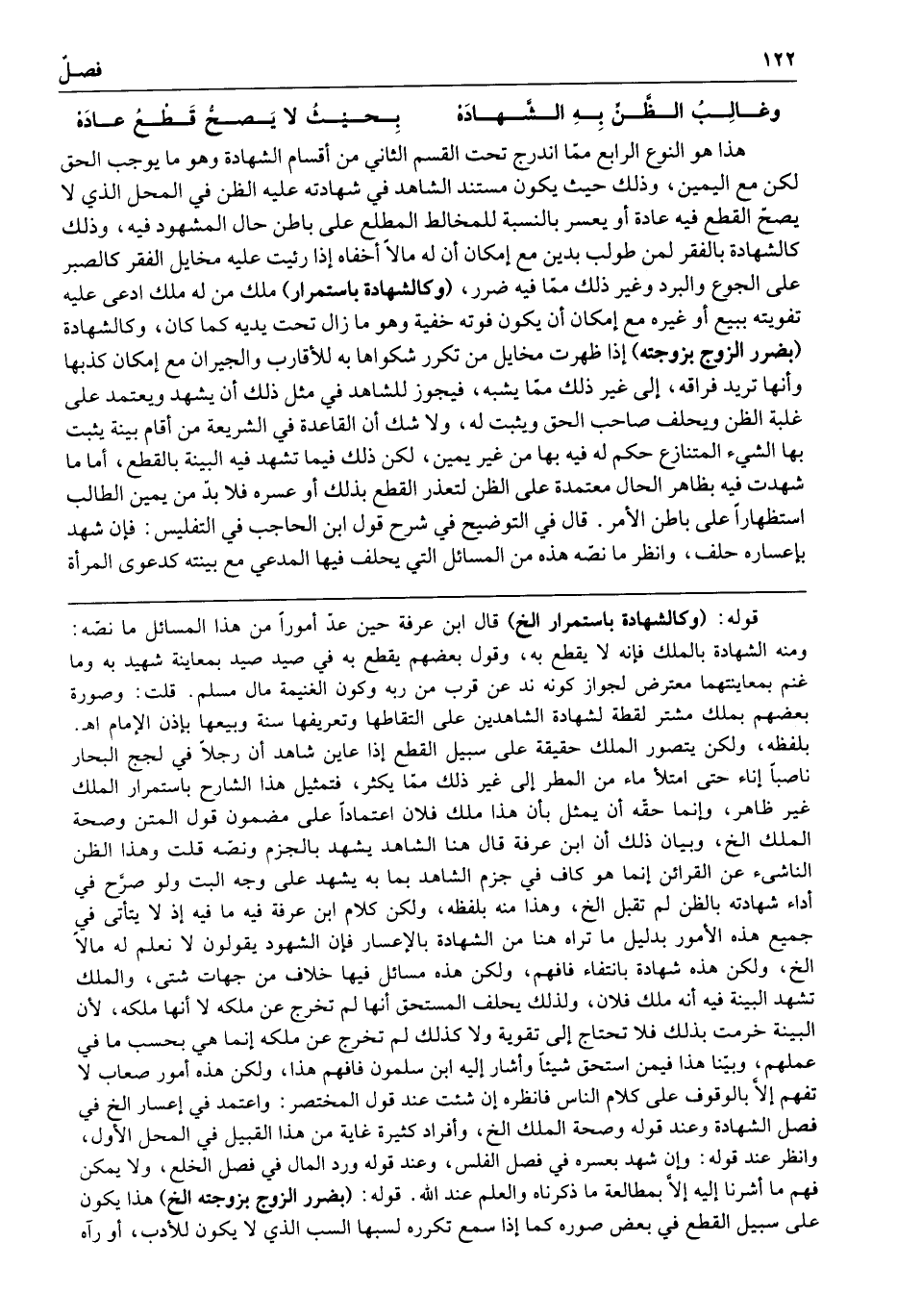 وغالب الظن به الشهاده بحيث لا يصح قطع عاده هذا هو النوع الرابع مما اندرج تحت القسم الثاني من أقسام الشهادة وهو ما يوجب الحق لكن مع اليمين وذلك حيث يكون مستند الشاهد في شهادته عليه الظن في المحل الذي لا يصح القطع فيه عادة أو يعسر بالنسبة للمخالط المطلع على باطن حال المشهود فيه وذلك كالشهادة بالفقر لمن طولب بدين مع إمكان أن له مالا أخفاه إذا رئيت عليه مخايل الفقر كالصبر على الجوع والبرد وغير ذلك مما فيه ضرر وكالشهادة باستمرار ملك من له ملك ادعى عليه تفويته ببيع أو غيره مع إمكان أن يكون فوته خفية وهو ما زال تحت يديه كما كان وكالشهادة بضرر الزوج بزوجته إذا ظهرت مخايل من تكرر شكواها به للأقارب والجيران مع إمكان كذبها وأنها تريد فراقه إلى غير ذلك مما يشبه فيجوز للشاهد في مثل ذلك أن يشهد ويعتمد على غلبة الظن ويحلف صاحب الحق ويثبت له ولا شك أن القاعدة في الشريعة من أقام بينة يثبت بها الشيء المتنازع حكم له فيه بها من غير يمين لكن ذلك فيما تشهد فيه البينة بالقطع أما ما شهدت فيه بظاهر الحال معتمدة على الظن لتعذر القطع بذلك أو عسره فلا بد من يمين الطالب استظهارا على باطن الأمر