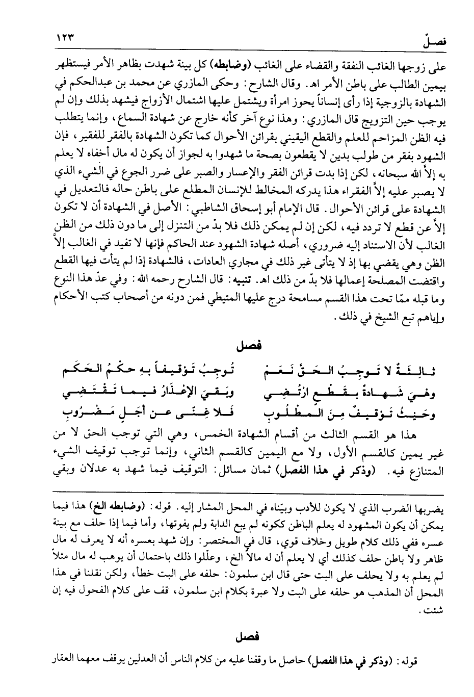ا هـ وقال الشارح وحكى المازري عن محمد بن عبدالحكم في الشهادة بالزوجية إذا رأى إنسانا يحوز امرأة ويشتمل عليها اشتمال الأزواج فيشهد بذلك وإن لم يوجب حين التزويج قال المازري وهذا نوع آخر كأنه خارج عن شهادة السماع وإنما يتطلب فيه الظن المزاحم للعلم والقطع اليقيني بقرائن الأحوال كما تكون الشهادة بالفقر للفقير فإن الشهود بفقر من طولب بدين لا يقطعون بصحة ما شهدوا به لجواز أن يكون له مال أخفاه لا يعلم به إلا الله سبحانه لكن إذا بدت قرائن الفقر والإعسار والصبر على ضرر الجوع في الشيء الذي لا يصبر عليه إلا الفقراء هذا يدركه المخالط للإنسان المطلع على باطن حاله فالتعديل في الشهادة على قرائن الأحوال