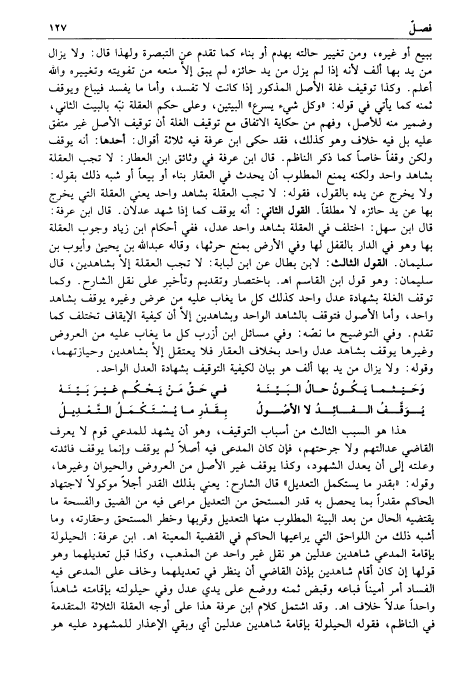 ا هـ وقد اشتمل كلام ابن عرفة هذا على أوجه العقلة الثلاثة المتقدمة في الناظم فقوله الحيلولة بإقامة شاهدين عدلين أي وبقي الإعذار للمشهود عليه هو