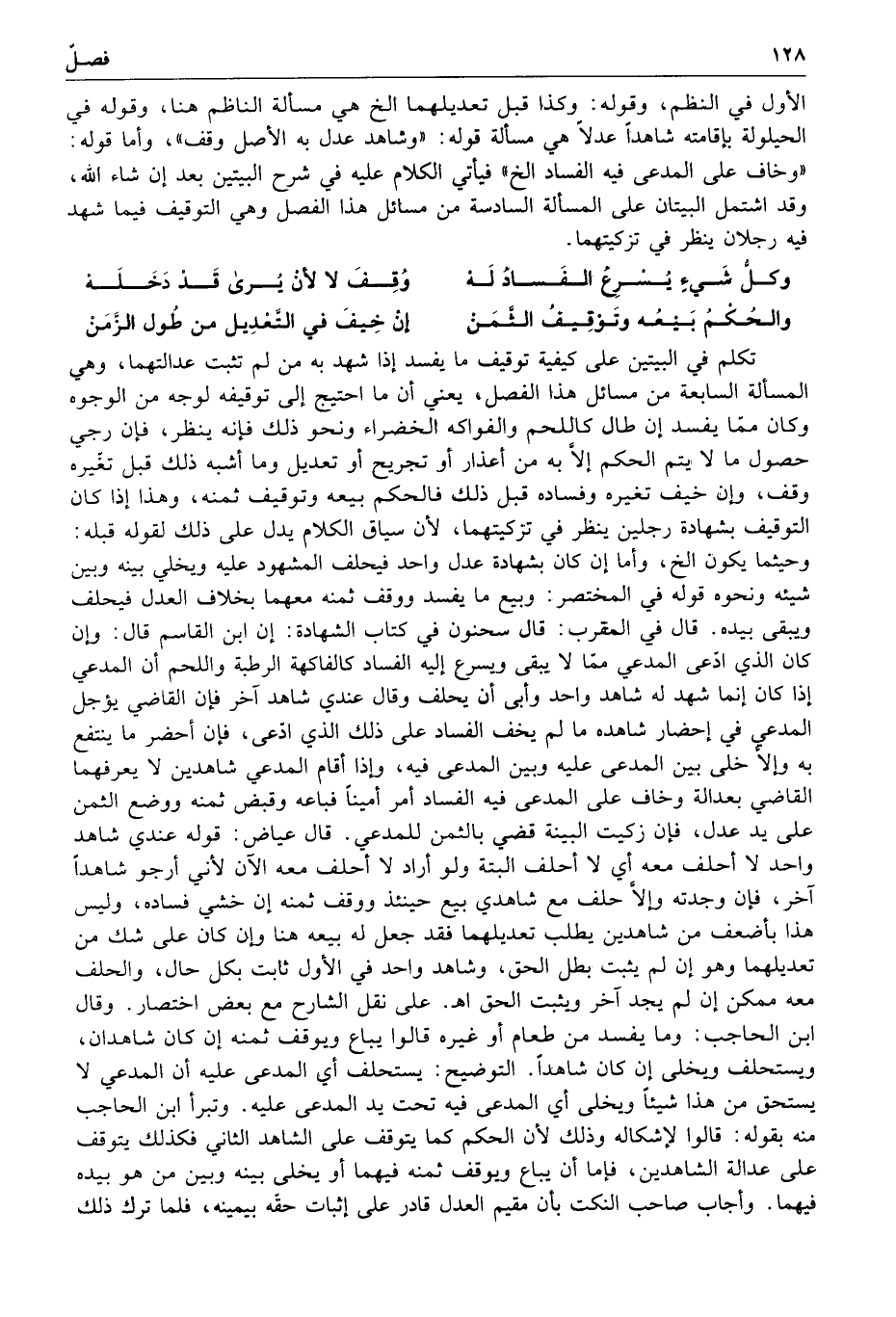 وكل شيء يسرع الفساد له وقف لا لأن يرى قد دخله والحكم بيعه وتوقيف الثمن إن خيف في التعديل من طول الزمن تكلم في البيتين على كيفية توقيف ما يفسد إذا شهد به من لم تثبت عدالتهما وهي المسألة السابعة من مسائل هذا الفصل يعني أن ما احتيج إلى توقيفه لوجه من الوجوه وكان مما يفسد إن طال كاللحم والفواكه الخضراء ونحو ذلك فإنه ينظر فإن رجي حصول ما لا يتم الحكم إلا به من إعذار أو تجريح أو تعديل وما أشبه ذلك قبل تغيره وقف وإن خيف تغيره وفساده قبل ذلك فالحكم بيعه وتوقيف ثمنه وهذا إذا كان التوقيف بشهادة رجلين ينظر في تزكيتهما لأن سياق الكلام يدل على ذلك لقوله قبله وحيثما يكون إلخ