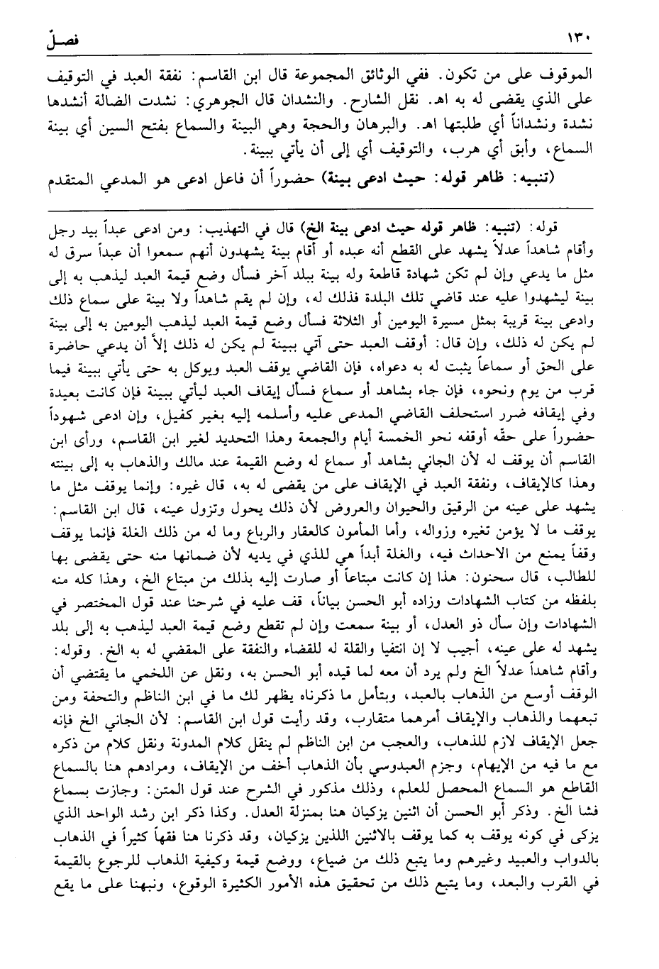 ا هـ والبرهان والحجة وهي البينة والسماع بفتح السين أي بينة السماع وأبق أي هرب والتوقيف أي إلى أن يأتي ببينة