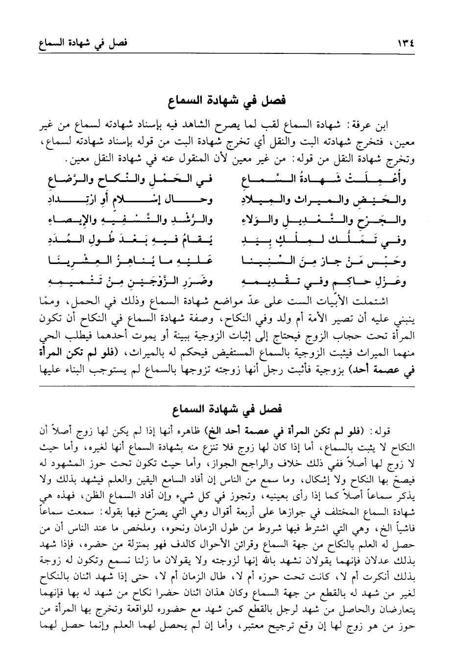 134 فصل في شهادة السماع ابن عرفة شهادة السماع لقب لما يصرح الشاهد فيه بإسناد شهادته لسماع من غير معين فتخرج شهادته البت والنقل أي تخرج شهادة البت من قوله بإسناد شهادته لسماع وتخرج شهادة النقل من قوله من غير معين لأن المنقول عنه في شهادة النقل معين وأعملت شهادة السماع في الحمل والنكاح والرضاع والحيض والميراث والميلاد وحال إسلام أو ارتداد والجرح والتعديل والولاء والرشد والتسفيه والإيصاء وفي تملك لملك بيد يقام فيه بعد طول المدد وحبس من جاز من السنينا عليه ما يناهز العشرينا وعزل حاكم وفي تقديمه وضرر الزوجين من تتميمه اشتملت الأبيات الست على عد مواضع شهادة السماع وذلك في الحمل ومما ينبني عليه أن تصير الأمة أم ولد وفي النكاح وصفة شهادة السماع في النكاح أن تكون المرأة تحت حجاب الزوج فيحتاج إلى إثبات الزوجية ببينة أو يموت أحدهما فيطلب الحي منهما الميراث فيثبت الزوجية بالسماع المستفيض فيحكم له بالميراث فلو لم تكن المرأة في عصمة أحد بزوجية فأثبت رجل أنها زوجته تزوجها بالسماع لم يستوجب البناء عليها