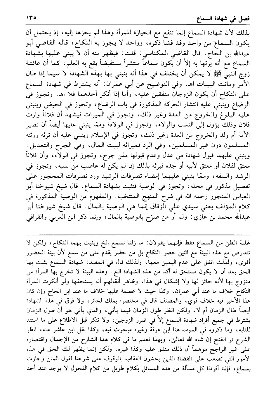 قال القاضي المكناسي قلت فيظهر منه أن لا يبني عليها بشهادة السماع مع أنه يرثها به إلا أن يكون سماعا منتشرا مستفيضا يقع به العلم كما أن عائشة زوج النبي صلى الله عليه وسلم لا يمكن أن يختلف في هذا أنه ينبني بها بهذه الشهادة لا سيما إذا طال الأمر وماتت البينات