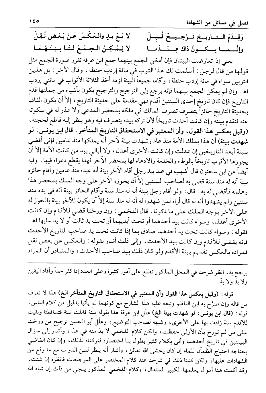 وقدم التاريخ ترجيح قبل لا مع يد والعكس عن بعض نقل وإنما يكون ذاك عندما لا يمكن الجمع لنا بينهما يعني إذا تعارضت البينتان فإن أمكن الجمع بينهما جمع ابن عرفة تقرر صورة الجمع مثل قولها من قال لرجل أسلمت لك هذا الثوب في مائة إردب حنطة وقال الآخر بل هذين الثوبين سواء في مائة إردب حنطة وأقاما جميعا البينة لزمه أخذ الثلاثة الأثواب في مائتي إردب ا هـ وإن لم يمكن الجمع بينهما فإنه يرجع إلى الترجيح والترجيح يكون بأشياء من جملتها قدم التاريخ فإن كان تاريخ إحدى البينتين أقدم فهي مقدمة على حديثة التاريخ إلا أن يكون القائم بحديثة التاريخ حائزا يتصرف تصرف المالك في ملكه بمحضر المدعي ولا عذر له في سكوته عنه فتقدم بينته وإن كانت أحدث تاريخا لأن تركه بيده يتصرف فيه وهو ينظر إليه قاطع لحجته وقيل بعكس هذا القول وإن المعتبر في الاستحقاق التاريخ المتأخر قال ابن يونس لو شهدت بينة أن هذا يملك الأمة منذ عام وشهدت بينة لآخر أنه يملكها منذ عامين فإني أقضي ببينة أبعد التاريخين إن عدلت وإن كانت الأخرى أعدل ولا أبالي بيد من كانت الأمة إلا أن يحوزها الأقرب تاريخا بالوطء والخدمة والادعاء لها بمحضر الآخر فهذا يقطع دعواه فيها وفيه أيضا