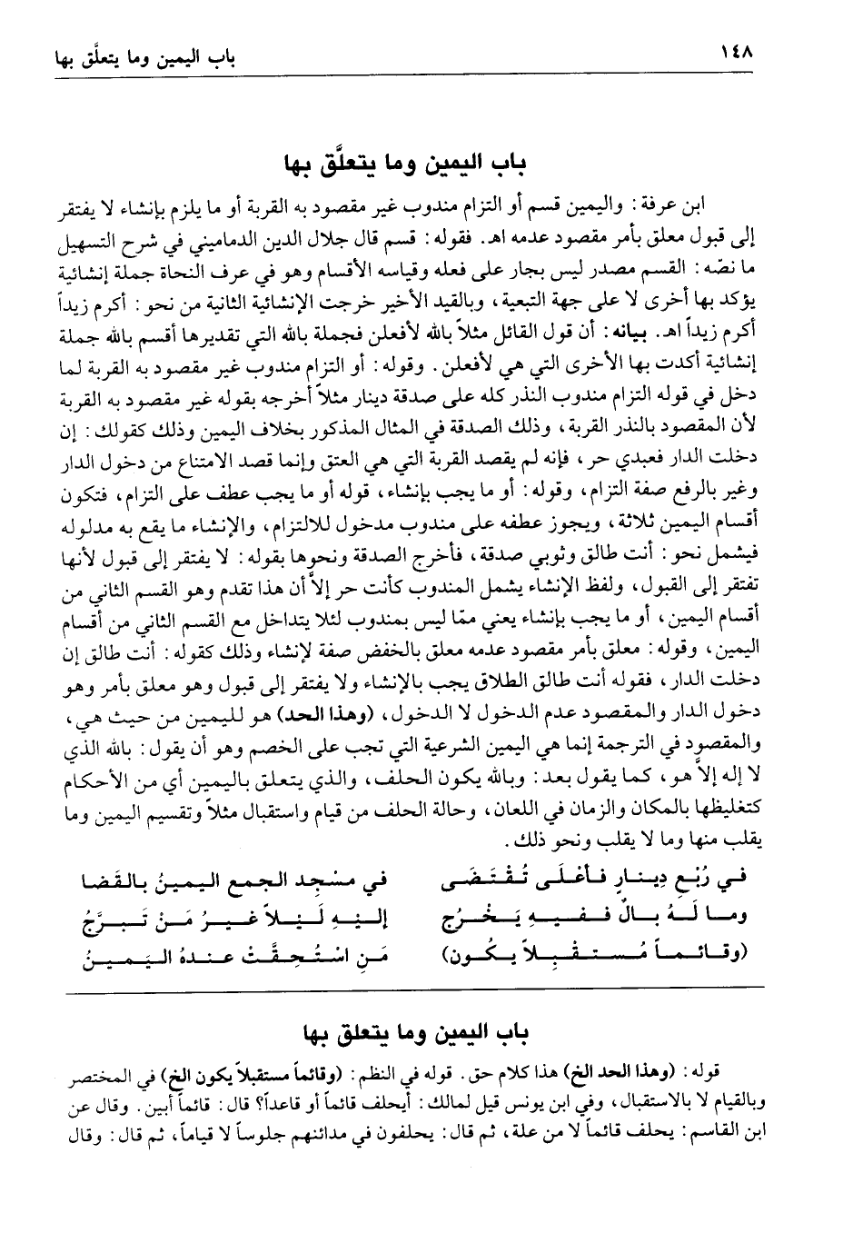 148 باب اليمين وما يتعلق بها ابن عرفة واليمين قسم أو التزام مندوب غير مقصود به القربة أو ما يلزم بإنشاء لا يفتقر إلى قبول معلق بأمر مقصود عدمه ا هـ فقوله قسم قال جلال الدين الدماميني في شرح التسهيل ما نصه القسم مصدر ليس بجار على فعله وقياسه الإقسام وهو في عرف النحاة جملة إنشائية يؤكد بها أخرى لا على جهة التبعية وبالقيد الأخير خرجت الإنشائية الثانية من نحو أكرم زيدا أكرم زيدا