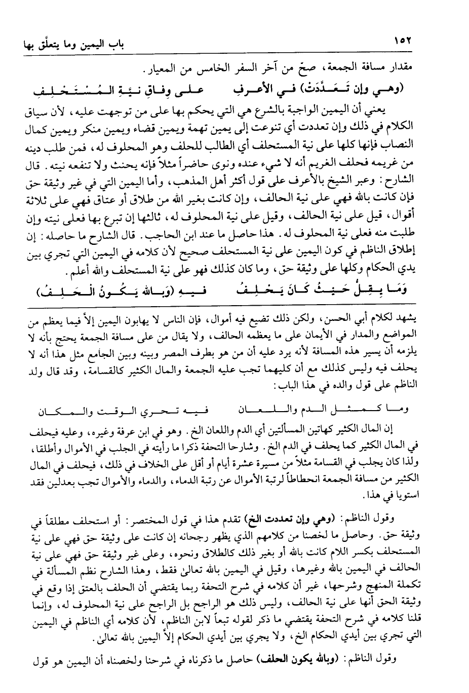 قال الشارح ما حاصله إن إطلاق الناظم في كون اليمين على نية المستحلف صحيح لأن كلامه في اليمين التي تجري بين يدي الحكام وكلها على وثيقة حق وما كان كذلك فهو على نية المستحلف والله أعلم