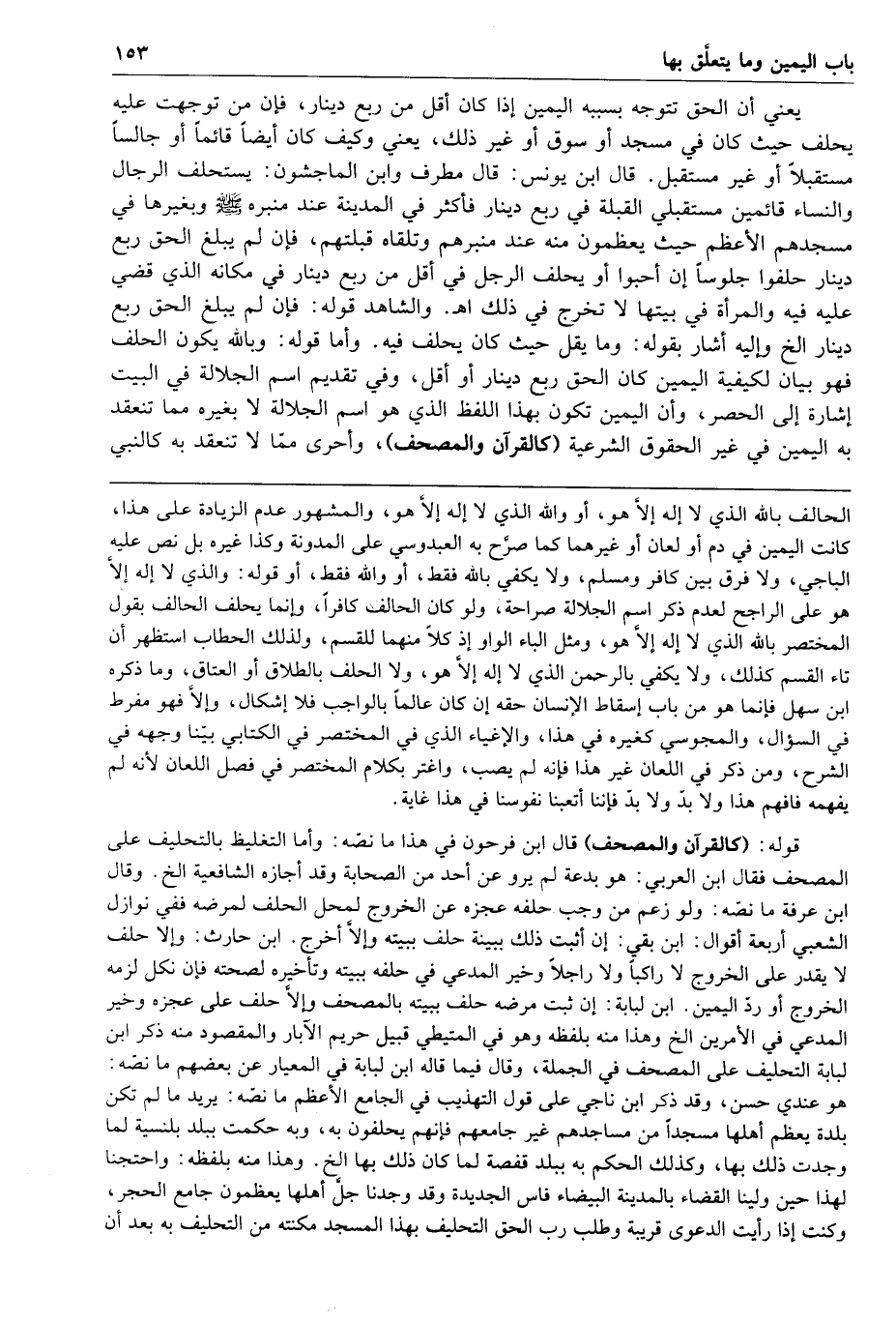 ا هـ والشاهد قوله فإن لم يبلغ الحق ربع دينار إلخ وإليه أشار بقوله وما يقل حيث كان يحلف فيه وأما قوله وبالله يكون الحلف فهو بيان لكيفية اليمين كان الحق ربع دينار أو أقل وفي تقديم اسم الجلالة في البيت إشارة إلى الحصر وإن اليمين تكون بهذا اللفظ الذي هو اسم الجلالة لا بغيره مما تنعقد به اليمين في غير الحقوق الشرعية كالقرآن والمصحف وأحرى مما لا تنعقد به كالنبي