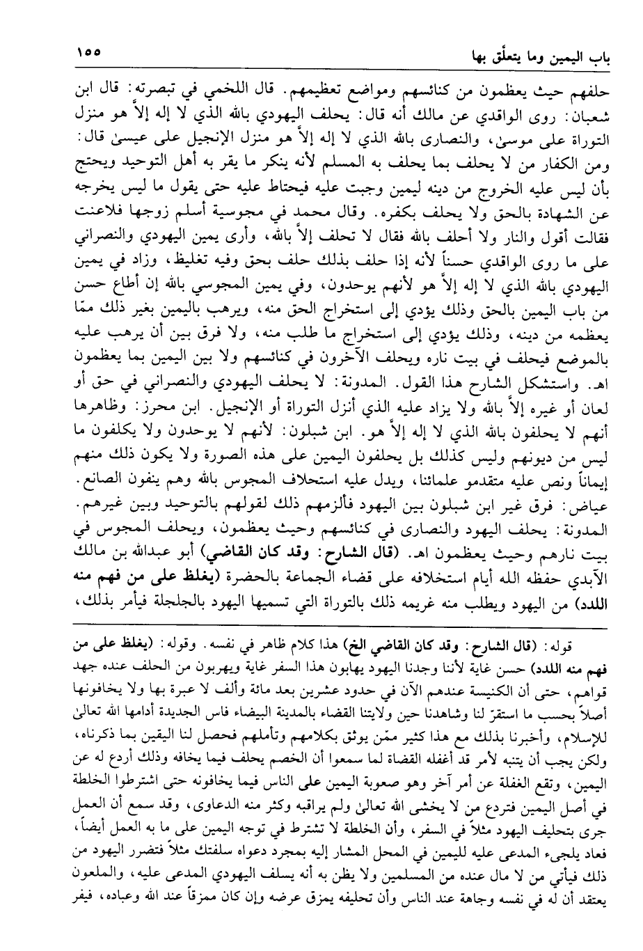 واستشكل الشارح هذا القول المدونة لا يحلف اليهودي والنصراني في حق أو لعان أو غيره إلا بالله ولا يزاد عليه الذي أنزل التوراة أو الإنجيل ابن محرز وظاهرها أنهم لا يحلفون بالله الذي لا إله إلا هو ابن شبلون لأنهم لا يوحدون ولا يكلفون ما ليس من ديونهم وليس كذلك بل يحلفون اليمين على هذه الصورة ولا يكون ذلك منهم إيمانا ونص عليه متقدمو علمائنا ويدل عليه استحلاف المجوس بالله وهم ينفون الصانع