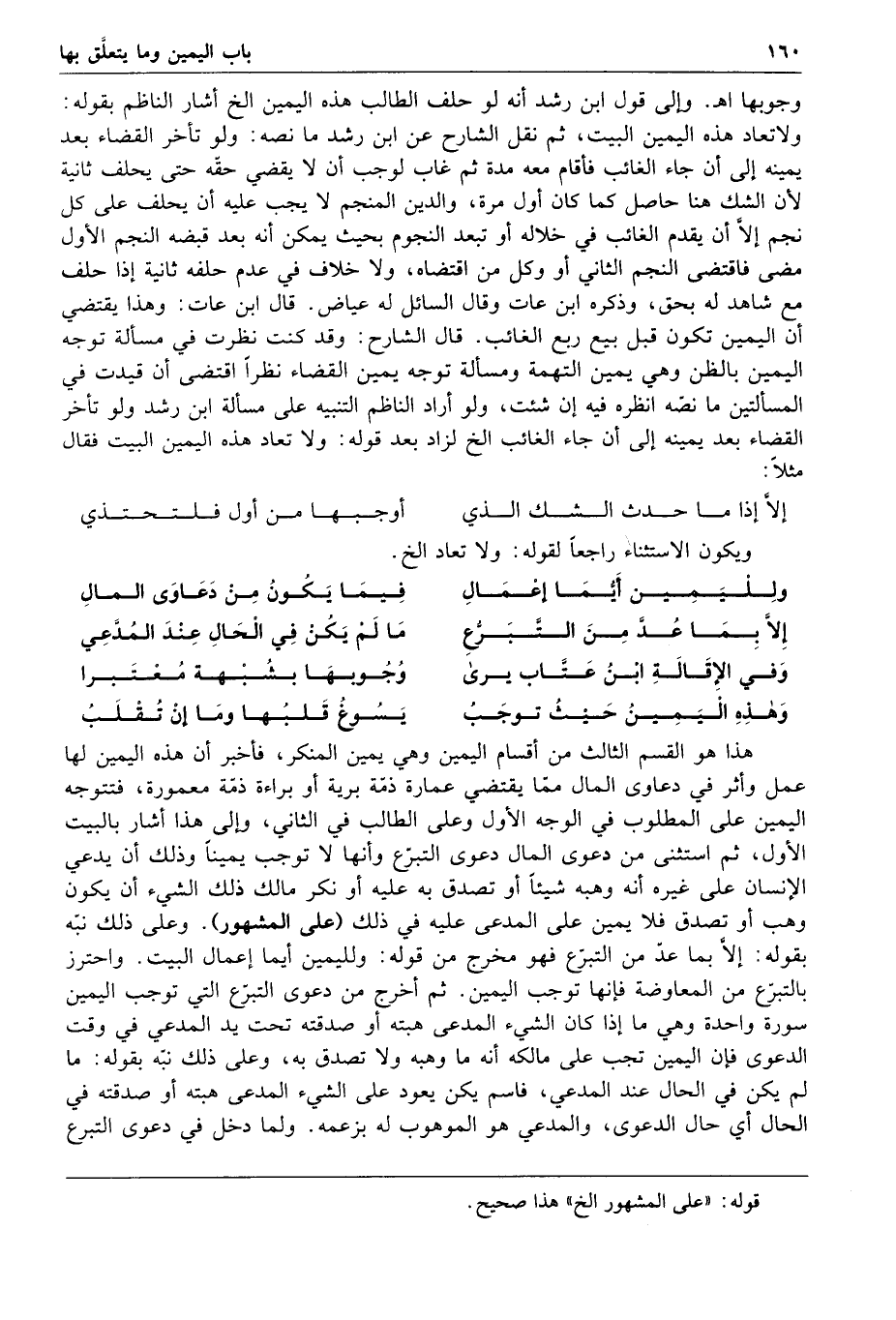 وإلى قول ابن رشد إنه لو حلف الطالب هذه اليمين إلخ أشار الناظم بقوله ولاتعاد هذه اليمين البيت ثم نقل الشارح عن ابن رشد ما نصه ولو تأخر القضاء بعد يمينه إلى أن جاء الغائب فأقام معه مدة ثم غاب لوجب أن لا يقضى حقه حتى يحلف ثانية لأن الشك هنا حاصل كما كان أول مرة والدين المنجم لا يجب عليه أن يحلف على كل نجم إلا أن يقدم الغائب في خلاله أو تبعد النجوم بحيث يمكن أنه بعد قبضه النجم الأول مضى فاقتضى النجم الثاني أو وكل من اقتضاه ولا خلاف في عدم حلفه ثانية إذا حلف مع شاهد له بحق وذكره ابن عات وقال السائل له عياض قال ابن عات وهذا يقتضي أن اليمين تكون قبل بيع ربع الغائب قال الشارح وقد كنت نظرت في مسألة توجه اليمين بالظن وهي يمين التهمة ومسألة توجه يمين القضاء نظرا اقتضى أن قيدت في المسألتين ما نصه انظره فيه إن شئت ولو أراد الناظم التنبيه على مسألة ابن رشد ولو تأخر القضاء بعد يمينه إلى أن جاء الغائب إلخ لزاد بعد قوله ولا تعاد هذه اليمين البيت فقال مثلا إلا إذا ما حدث الشك الذي أوجبها من أول فلتحتذي ويكون الاستثناء راجعا لقوله ولا تعاد إلخ