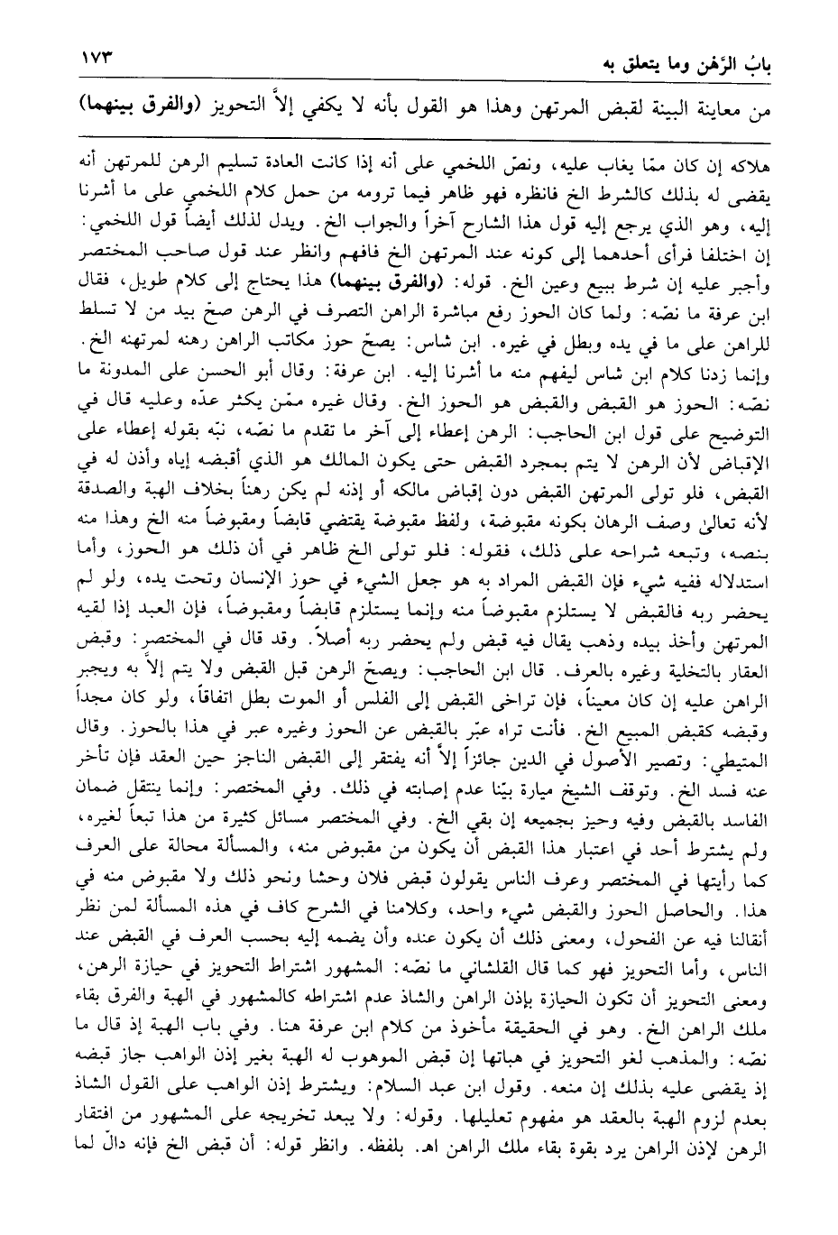 من معاينة البينة لقبض المرتهن وهذا هو القول بأنه لا يكفي إلا التحويز والفرق بينهما