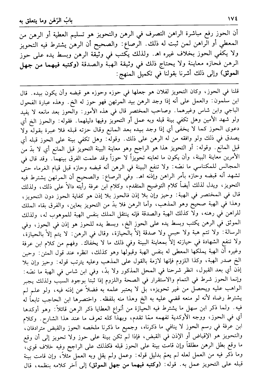 والصحيح أن الرهن يشترط فيه التحويز ولا يكفي الحوز بخلاف غيره ا هـ ولذلك يكتب في وثيقة الرهن وبسط يده على حوز الرهن فحازه معاينة ولا يحتاج ذلك في وثيقة الهبة والصدقة وكتبه فيهما من جهل الموثق