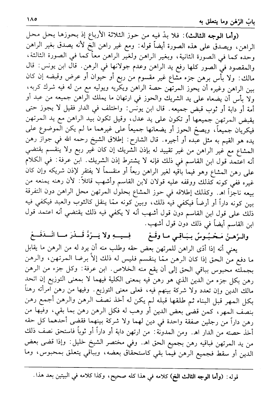 والرهن محبوس بباقي ما وقع فيه ولا يرد قدر ما اندفع يعني أنه إذا أدى الراهن للمرتهن بعض حقه وطلب منه أن يرد له من الرهن ما يقابل ما دفع من الحق إذا كان الرهن مما ينقسم فليس له ذلك إلا برضا المرتهن والرهن بجملته محبوس بباقي الحق إلى أن يقع منه الخلاص ابن عرفة