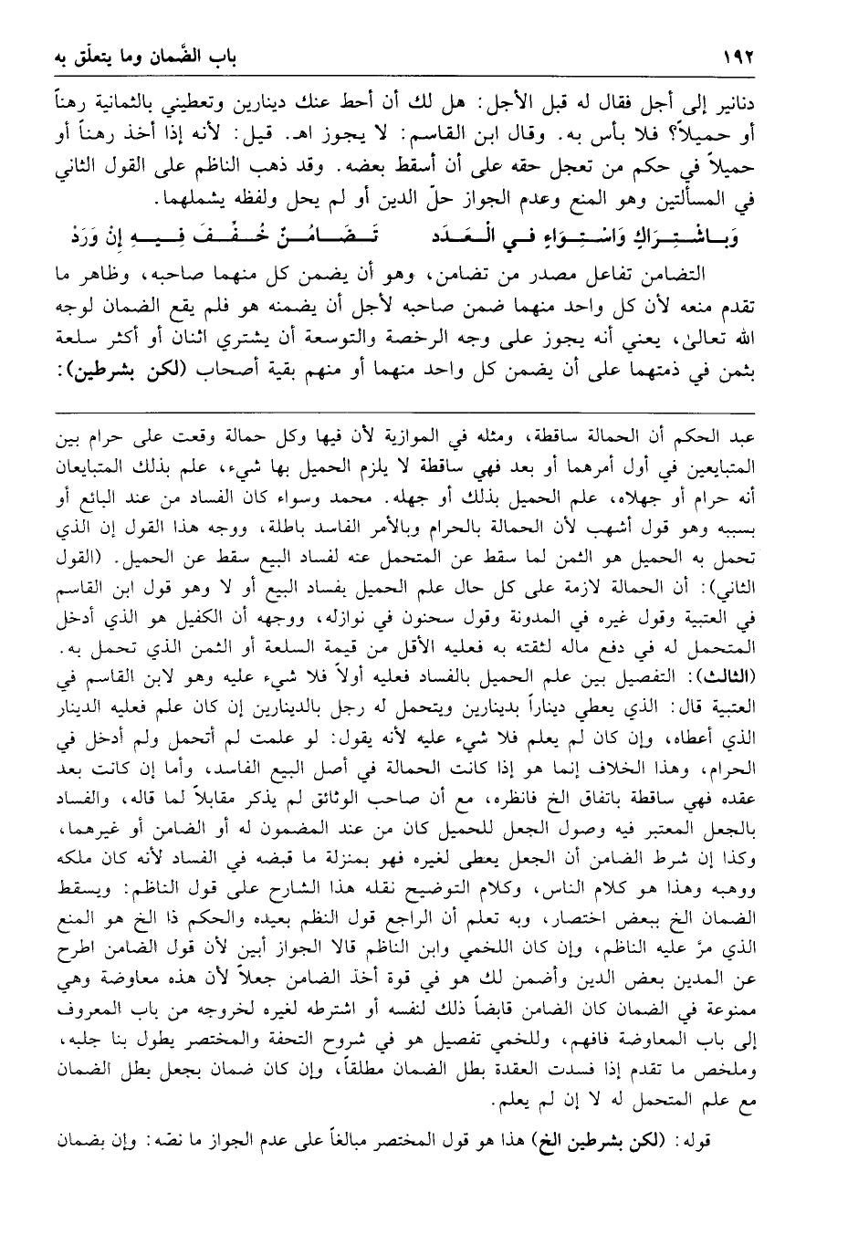 وباشتراك واستواء في العدد تضامن خفف فيه إن ورد التضامن تفاعل مصدر من تضامن وهو أن يضمن كل منهما صاحبه وظاهر ما تقدم منعه لأن كل واحد منهما ضمن صاحبه لأجل أن يضمنه هو فلم يقع الضمان لوجه الله تعالى يعني أنه يجوز على وجه الرخصة والتوسعة أن يشتري اثنان أو أكثر سلعة بثمن في ذمتهما على أن يضمن كل واحد منهما أو منهم بقية أصحاب لكن بشرطين