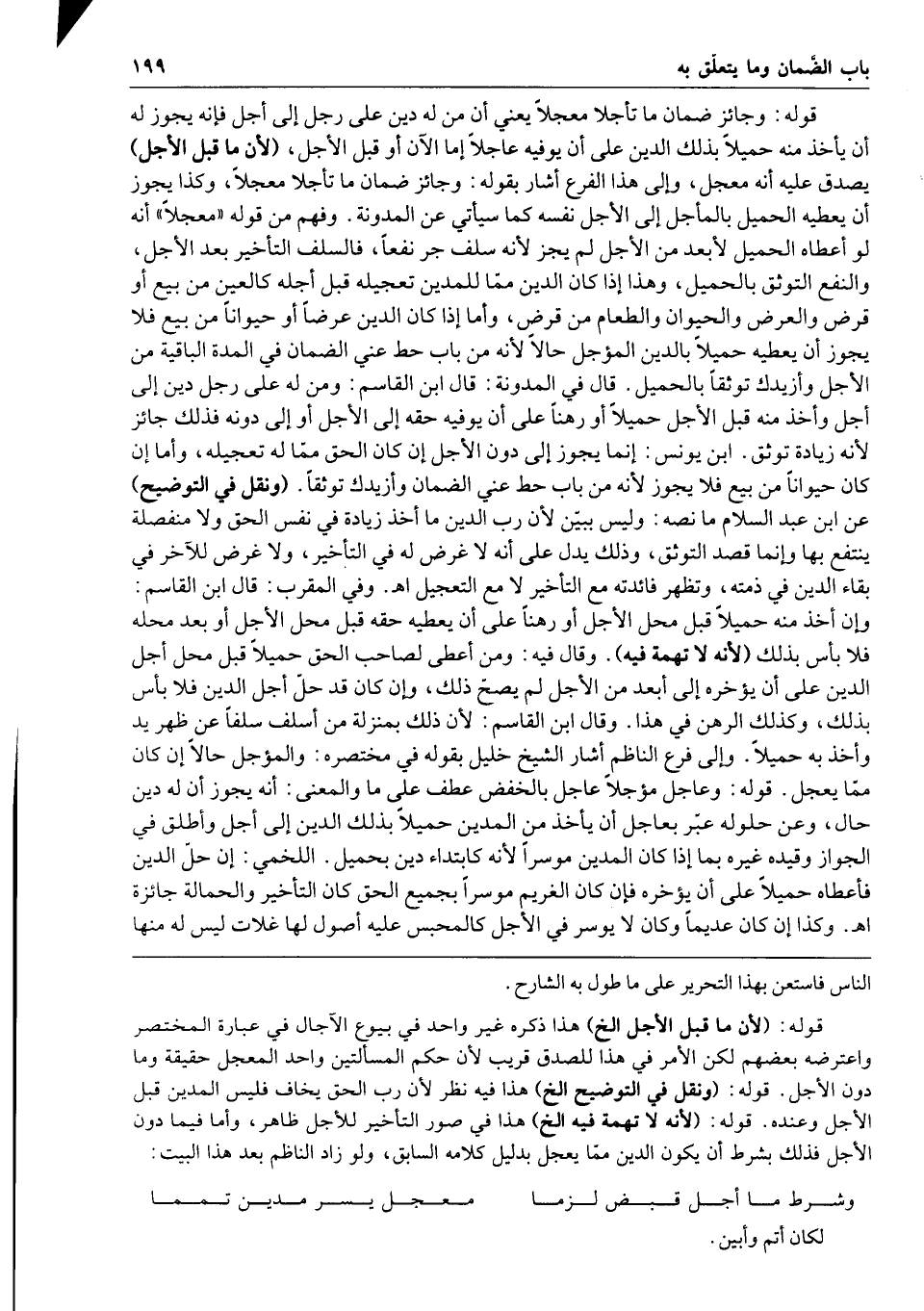 قوله وجائز ضمان ما تأجلا معجلا يعني أن من له دين على رجل إلى أجل فإنه يجوز له أن يأخذ منه حميلا بذلك الدين على أن يوفيه عاجلا إما الآن أو قبل الأجل لأن ما قبل الأجل يصدق عليه أنه معجل وإلى هذا الفرع أشار بقوله وجائز ضمان ما تأجلا معجلا وكذا يجوز أن يعطيه الحميل بالمأجل إلى الأجل نفسه كما سيأتي عن المدونة