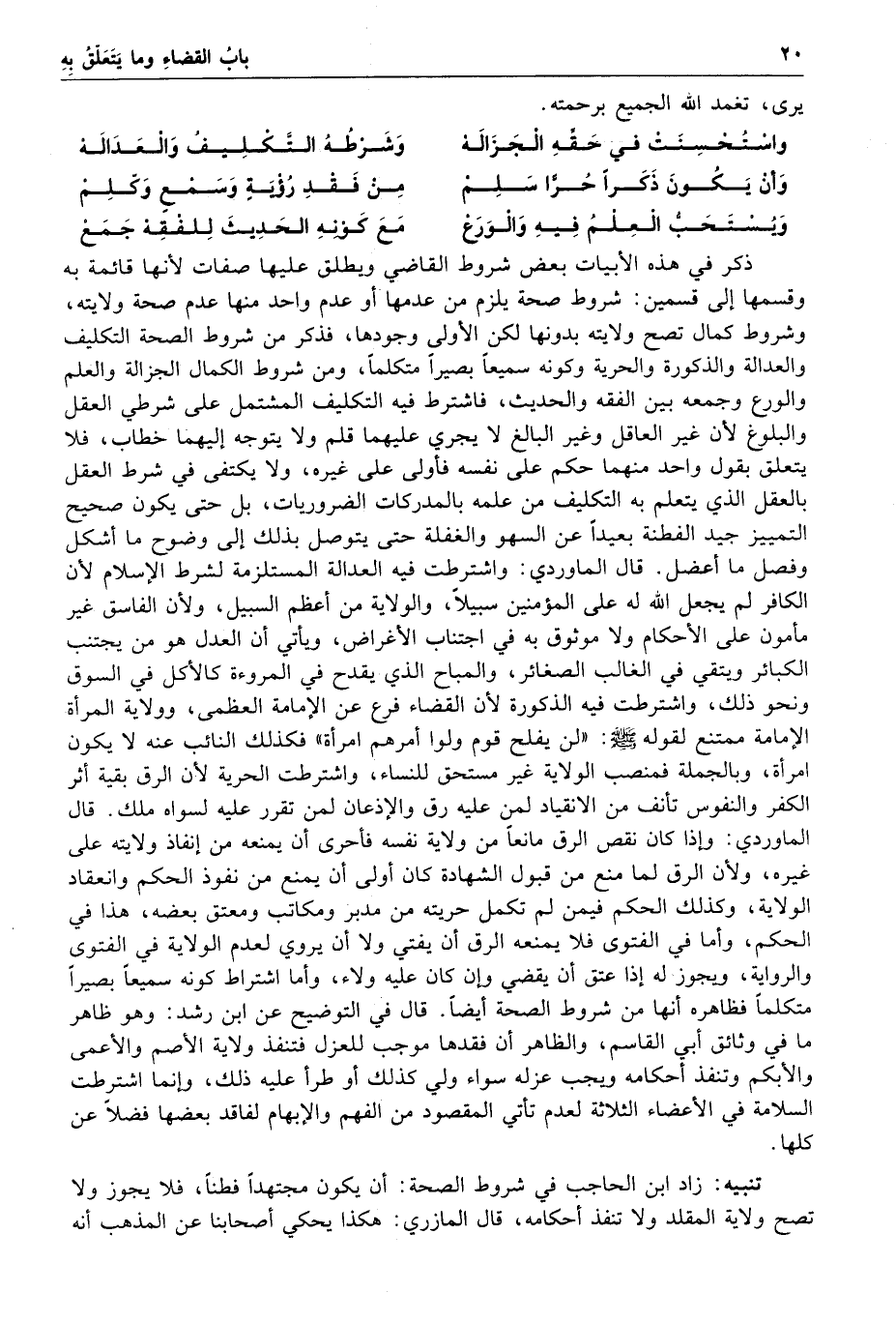 يرى تغمد الله الجميع برحمته واستحسنت في حقه الجزالة وشرطه التكليف والعدالة وأن يكون ذكرا حرا سلم من فقد رؤية وسمع وكلم ويستحب العلم فيه والورع مع كونه الحديث للفقه جمع ذكر في هذه الأبيات بعض شروط القاضي ويطلق عليها صفات لأنها قائمة به وقسمها إلى قسمين شروط صحة يلزم من عدمها أو عدم واحد منها عدم صحة ولايته وشروط كمال تصح ولايته بدونها لكن الأولى وجودها فذكر من شروط الصحة التكليف والعدالة والذكورة والحرية وكونه سميعا بصيرا متكلما