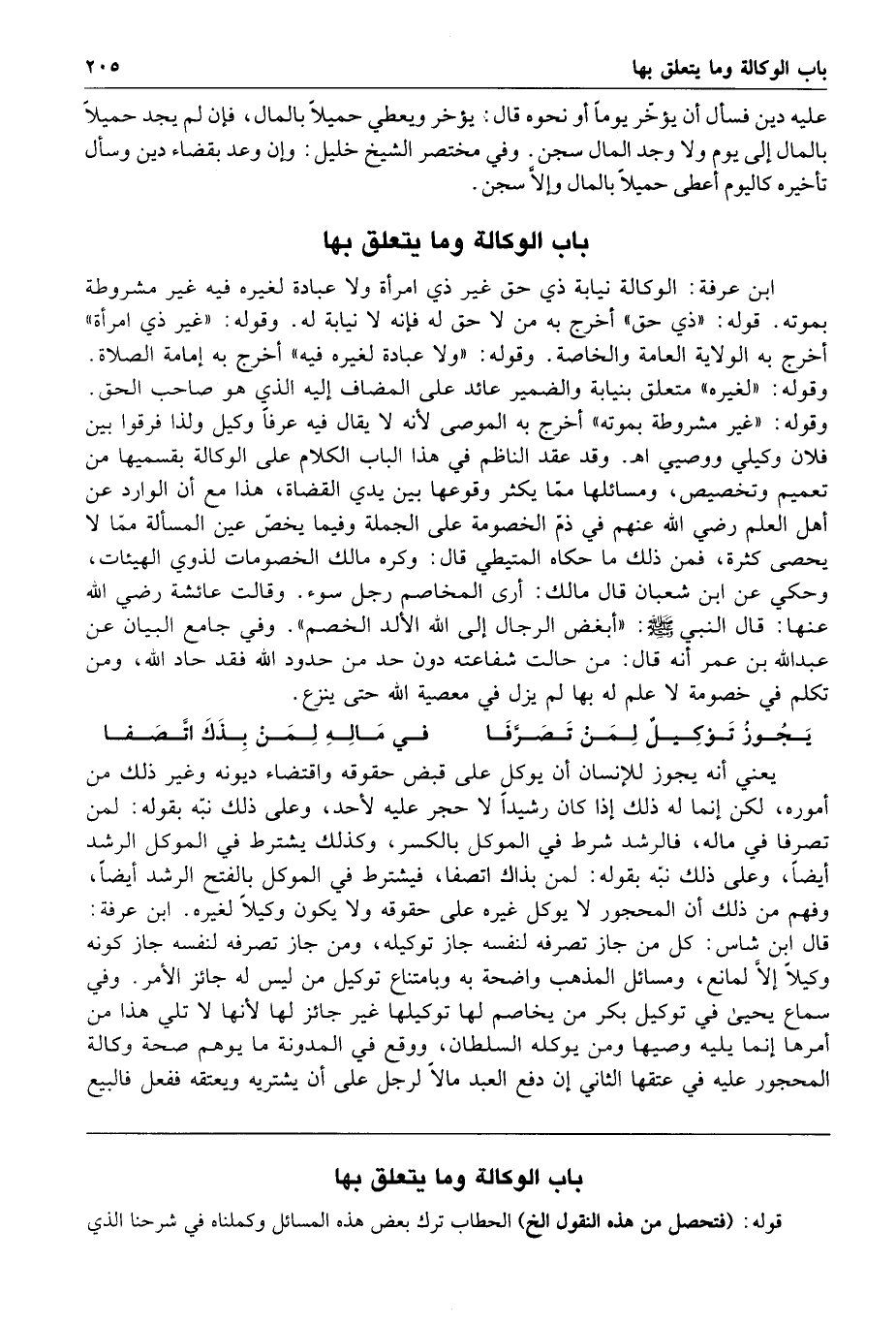 وفي جامع البيان عن عبد الله بن عمر أنه قال من حالت شفاعته دون حد من حدود الله فقد حاد الله ومن تكلم في خصومة لا علم له بها لم يزل في معصية الله حتى ينزع يجوز توكيل لمن تصرفا في ماله لمن بذك اتصفا يعني أنه يجوز للإنسان أن يوكل على قبض حقوقه واقتضاء ديونه وغير ذلك من أموره لكن إنما له ذلك إذا كان رشيدا لا حجر عليه لأحد وعلى ذلك نبه بقوله لمن تصرفا في ماله فالرشد شرط في الموكل بالكسر وكذلك يشترط في الموكل الرشد أيضا وعلى ذلك نبه بقوله لمن بذاك اتصفا فيشترط في الموكل بالفتح الرشد أيضا وفهم من ذلك أن المحجور لا يوكل غيره على حقوقه ولا يكون وكيلا لغيره