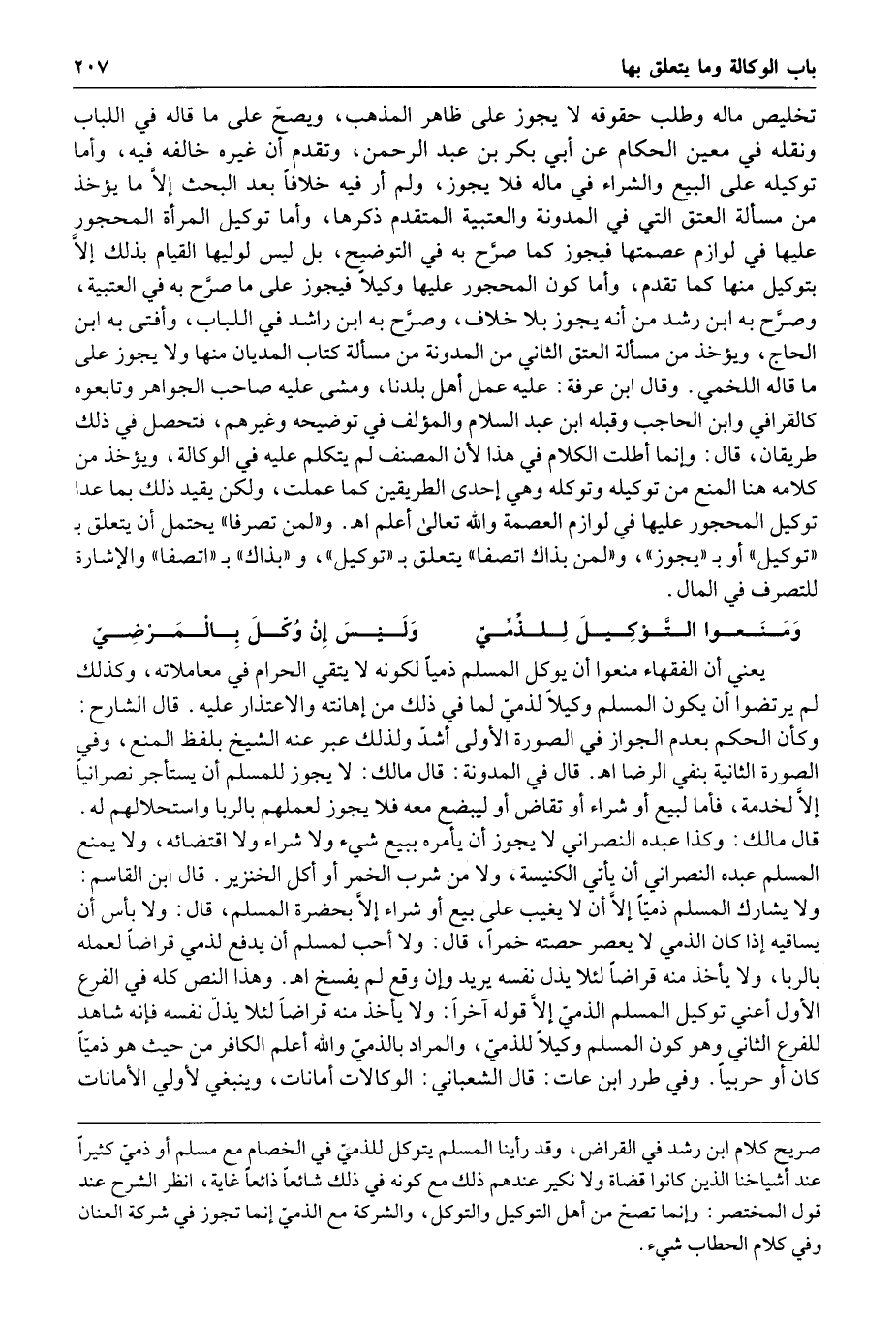 ومنعوا التوكيل للذمي وليس إن وكل بالمرضي يعني أن الفقهاء منعوا أن يوكل المسلم ذميا لكونه لا يتقي الحرام في معاملاته وكذلك لم يرتضوا أن يكون المسلم وكيلا لذمي لما في ذلك من إهانته والاعتذار عليه