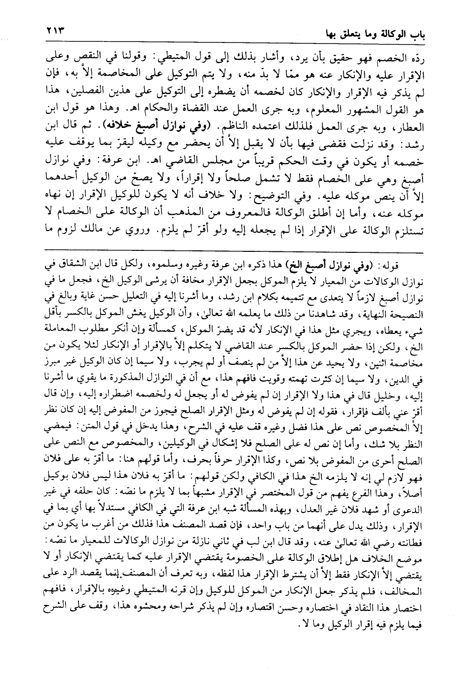 ابن عرفة وفي نوازل أصبغ وهي على الخصام فقط لا تشمل صلحا ولا إقرارا ولا يصح من الوكيل أحدهما إلا أن ينص موكله عليه