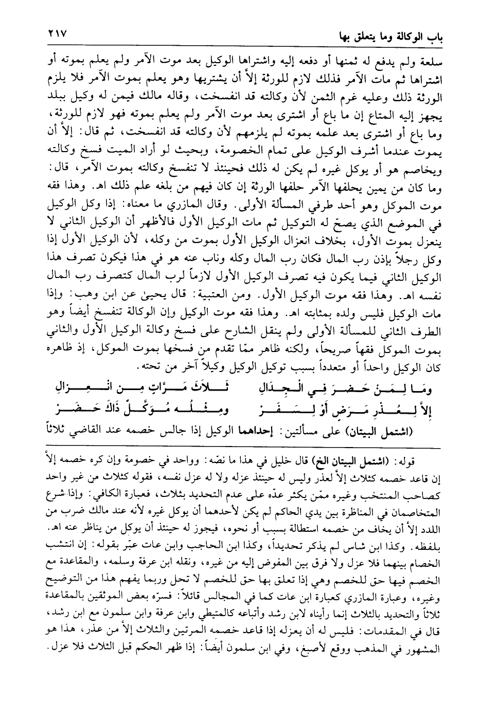 وما لمن حضر في الجدال ثلاث مرات من انعزال إلا لعذر مرض أو لسفر ومثله موكل ذاك حضر اشتمل البيتان على مسألتين إحداهما الوكيل إذا جالس خصمه عند القاضي ثلاثا